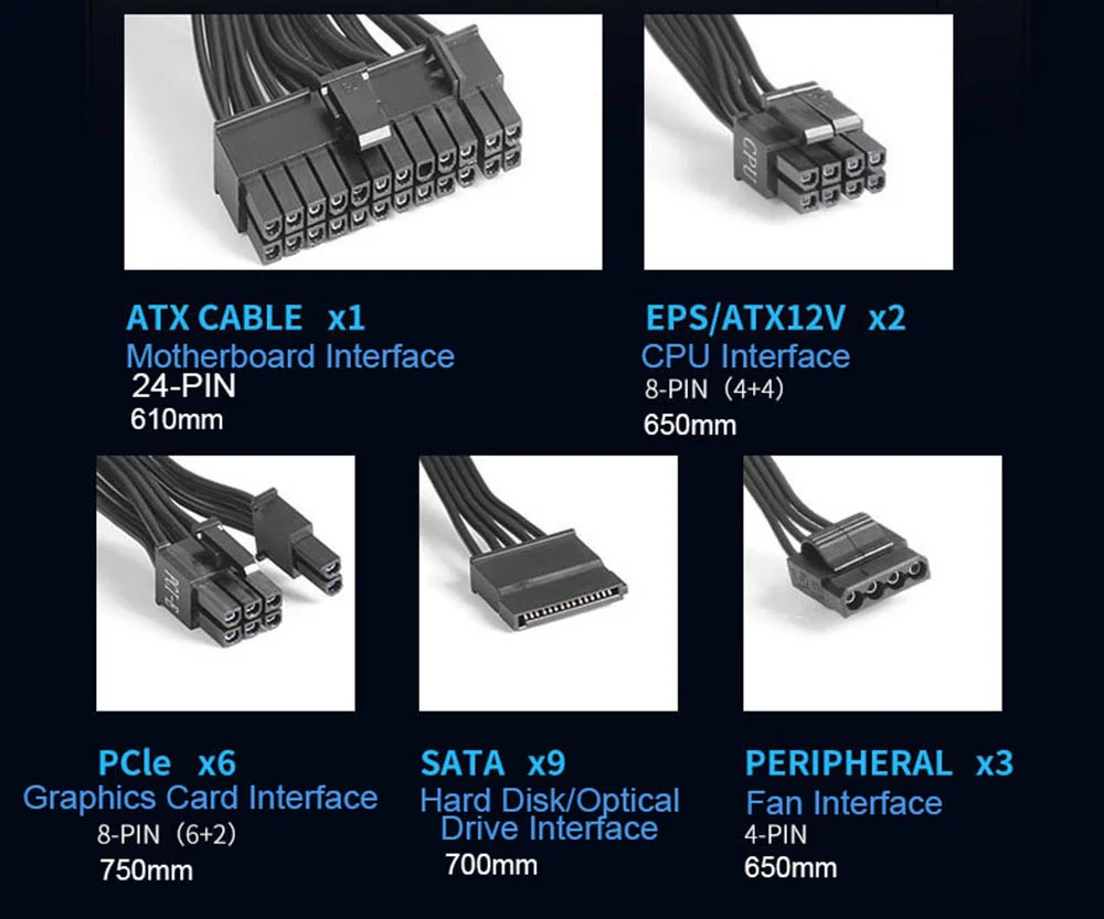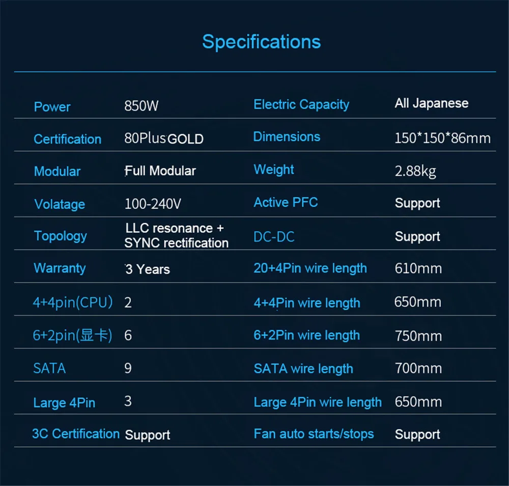 -Размер источника питания: 150 мм * 150 мм * 86 мм -Стандарт питания: ATX -Номинальная мощность: 850 Вт -Максимальная мощность: 950 Вт -80 плюс Сертификат: 80 плюс золото -Входное напряжение: 100-240 В -Мощность линии: 1,5 м -Тип интерфейса: 20 + 4pin -Вес: 2,90 кг -Интерфейс SATA: 9 -Тип PFC: Активный -Модульная: полная модульная -Контроль температуры: Поддержка -Аутентификация: CCC, RoHS -Использование сцен: E-Sport/крупномасштабная игра -Гарантия: 3 года