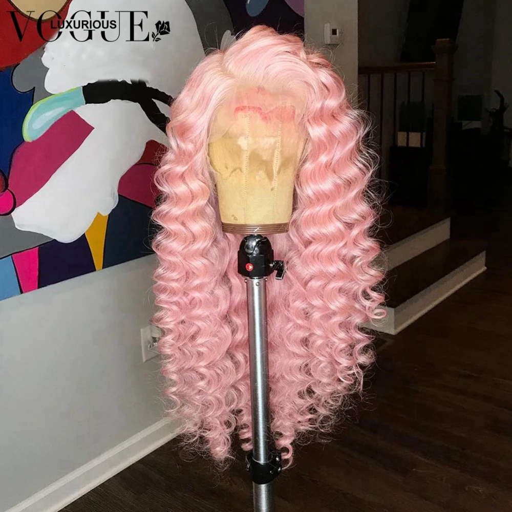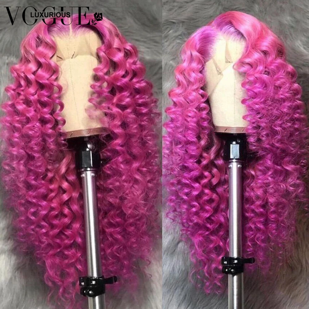 Ярко-розовый парик из человеческих волос, кудрявый парик из кружева спереди
