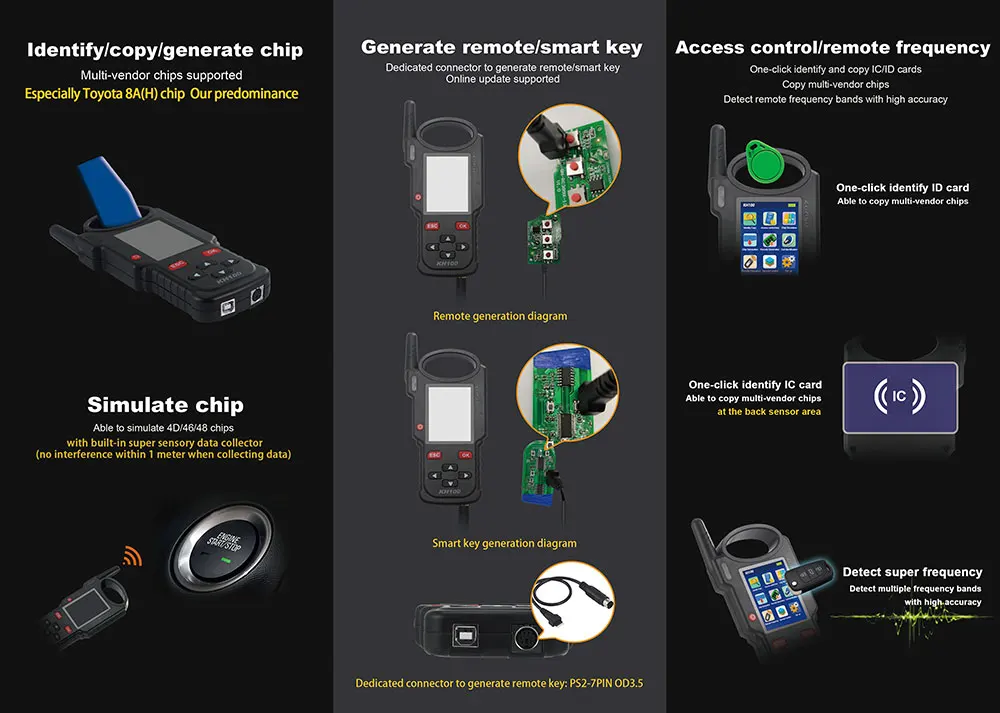 Название продукта: полнофункциональный ключ KH100 Описание: KH100-это универсальное портативное умное устройство, запущенное Shenzhen Lonsdor Technology Co., которое включает в себя специальные функции и функциональность, такие как: identify@chip, ключ управления доступом, имитирует чип, генерирует чип, генерирует пульт ДУ (ключ), генерирует смарт-ключ (Карта), обнаруживает удаленную частоту, Обнаружение инфракрасного сигнала, область поиска индукции, обнаружение IMMO, разблокировка Toyota smart key и т. д.