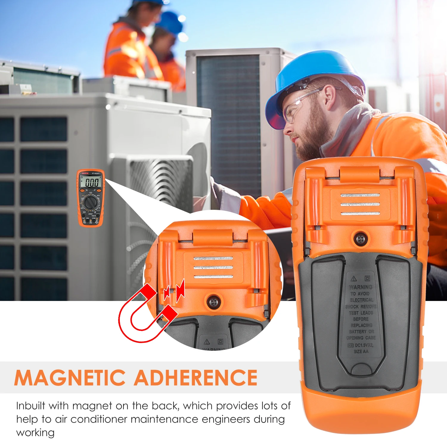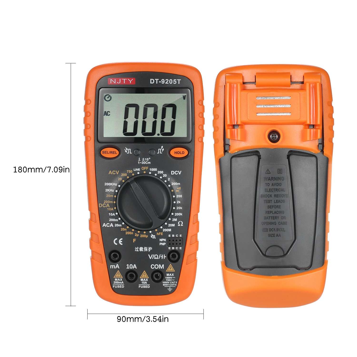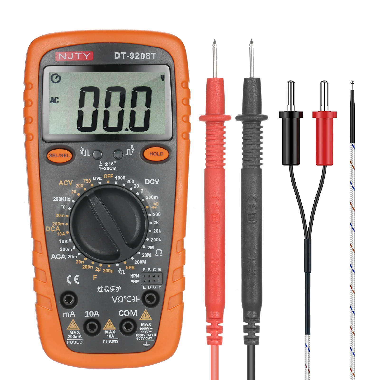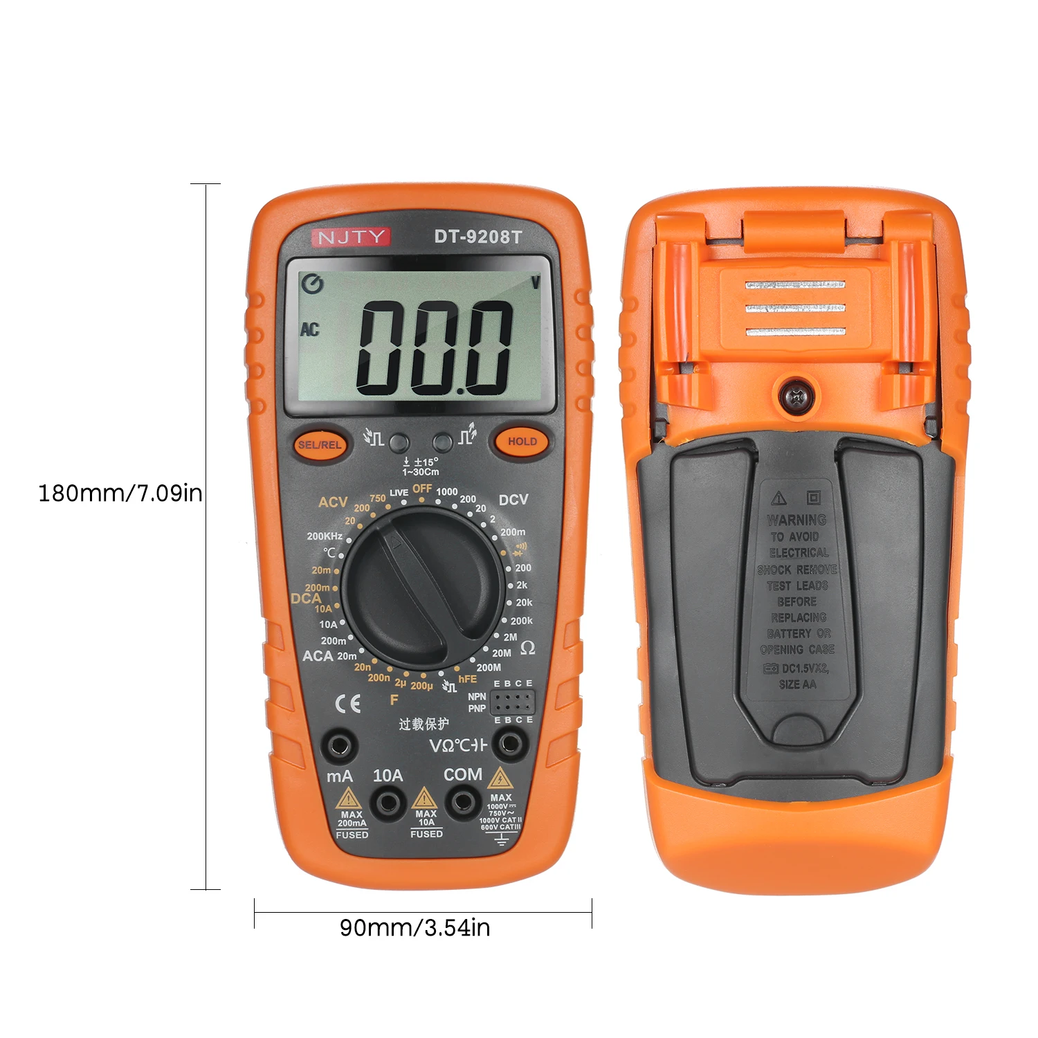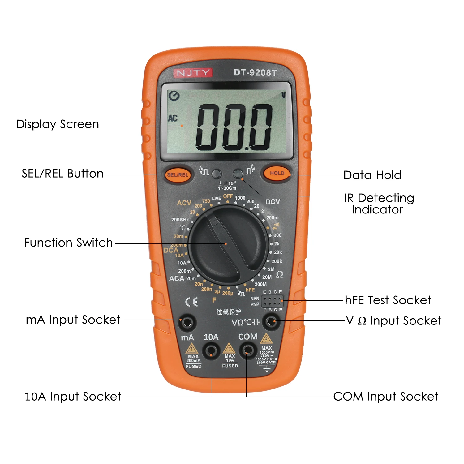 Несколько функций: мультиметр может использоваться для измерения переменного/постоянного тока, напряжения переменного/постоянного тока, сопротивления, частоты, емкости, температуры (только для модели DT9208T), диодов и непрерывности.