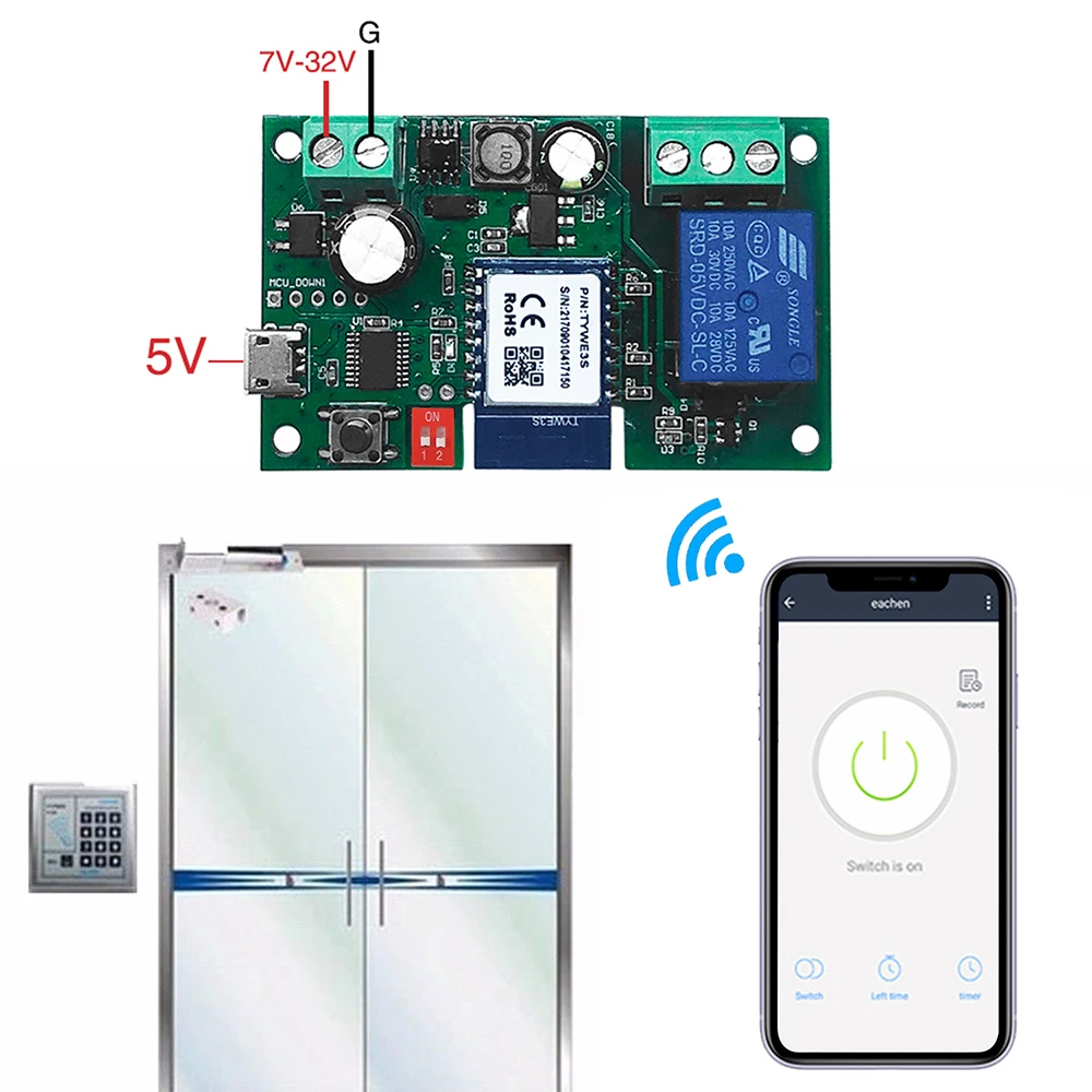 Рабочее напряжение: 5 В/7-32 В постоянного тока Светодиодный: 1 светодиодный (укажите рабочий режим, состояние wifi, релейный Режим ВКЛ/ВЫКЛ соответственно) Два входных интерфейса Поддерживает контроль различных диапазонов напряжения Usb-порт питания более удобный Потребление платы: <1 Вт Ток в режиме ожидания: 80 мА Максимальный входной ток: 10A Максимальная мощность: 2200 Вт Срок службы реле: ≥один миллион раз 100 м сопротивление электрической изоляции Напряжение электрического удара: 1000 в Максимальное время натяжения реле: 15 мс Максимальное время релейного реле: 5 мс Режим работы: инчинг/самоблокировка Беспроводной Стандартный: 2,4 ГГц, 802,11 b/g/n Мобильное приложение: Tuya / Smart life на Android/IOS Применение: контроль доступа, включение ПК, дверь гаража и т. Д. Компьютерное Применение: компьютерная загрузка с дистанционным управлением Рабочая температура: от-40 до + 70 градусов Рабочая влажность 40%-80% относительной влажности Размер изделия: 75*50*20 мм/2,96*1,97 * 0.79in