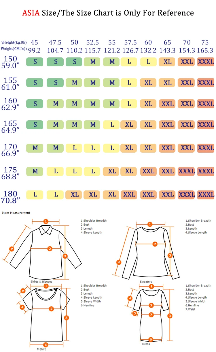 1.The size is ASIA size,it's smaller than US,EU,EU,UK,AU size. 2.Please allow 1-3 cm differences due to manual measurement . 3.Please check the size chart when place an order. |