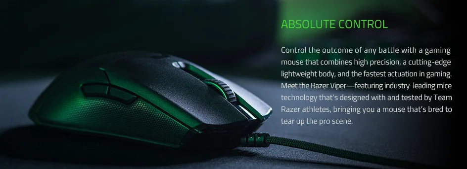 Управляйте результатом любой битвы с помощью игровой мыши, которая сочетает в себе высокую точность, передовое легкое тело и самое быстрое включение в игры. Познакомьтесь с Razer Viper-с ведущей в отрасли технологией мышей, которая разработана и протестирована спортсменами Team Razer, в результате чего вы получите мышь, которая разбила сцену pro.