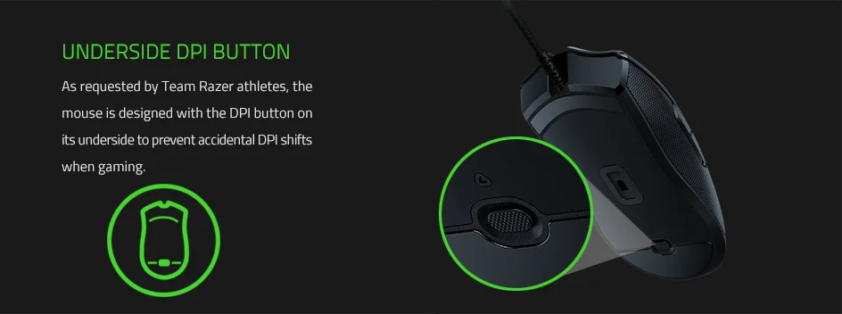 По просьбе спортсменов команды Razer мышь разработана с помощью кнопки DPI на нижней стороне, чтобы предотвратить случайные сдвиги DPI во время игр.
