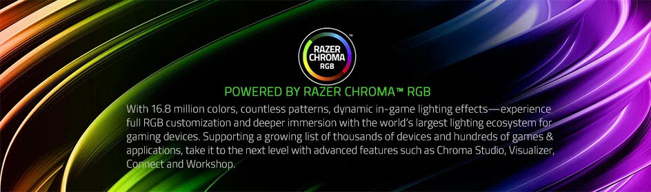 С 16,8 миллионов цветов, бесчисленные узоры, динамические эффекты освещения в игре-опыт полной настройки RGB и более глубокое погружение в крупнейшую в мире экосистему освещения для игровых устройств. Поддерживая растущий список тысяч устройств и сотни игр и приложений, возьмите его на следующий уровень с расширенными функциями, такими как Chroma Studio, Visualizer, Connect и Workshop.