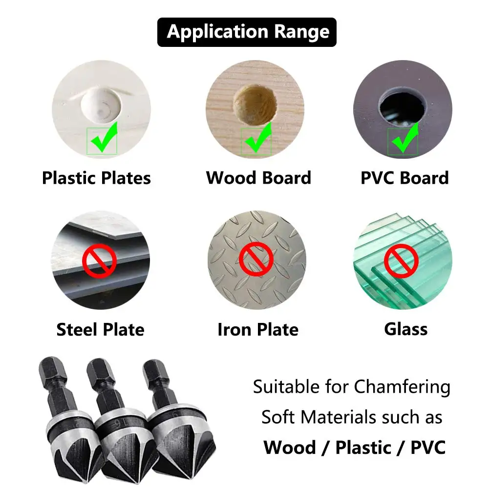 Отлично подходит для погружения отверстий на 90 градусов в заготовку с низкой твердостью. Подходит для сверления отверстий и снятия фаски из мягкого материала, например, идеально подходит для деревянных досок, ДВП, ДСП, фанеры, пластика, алюминиевых досок и т. д.