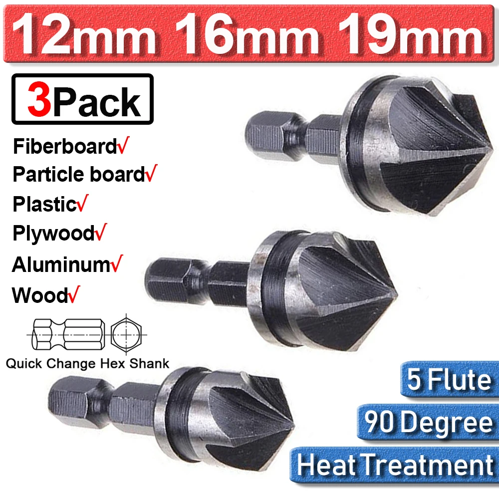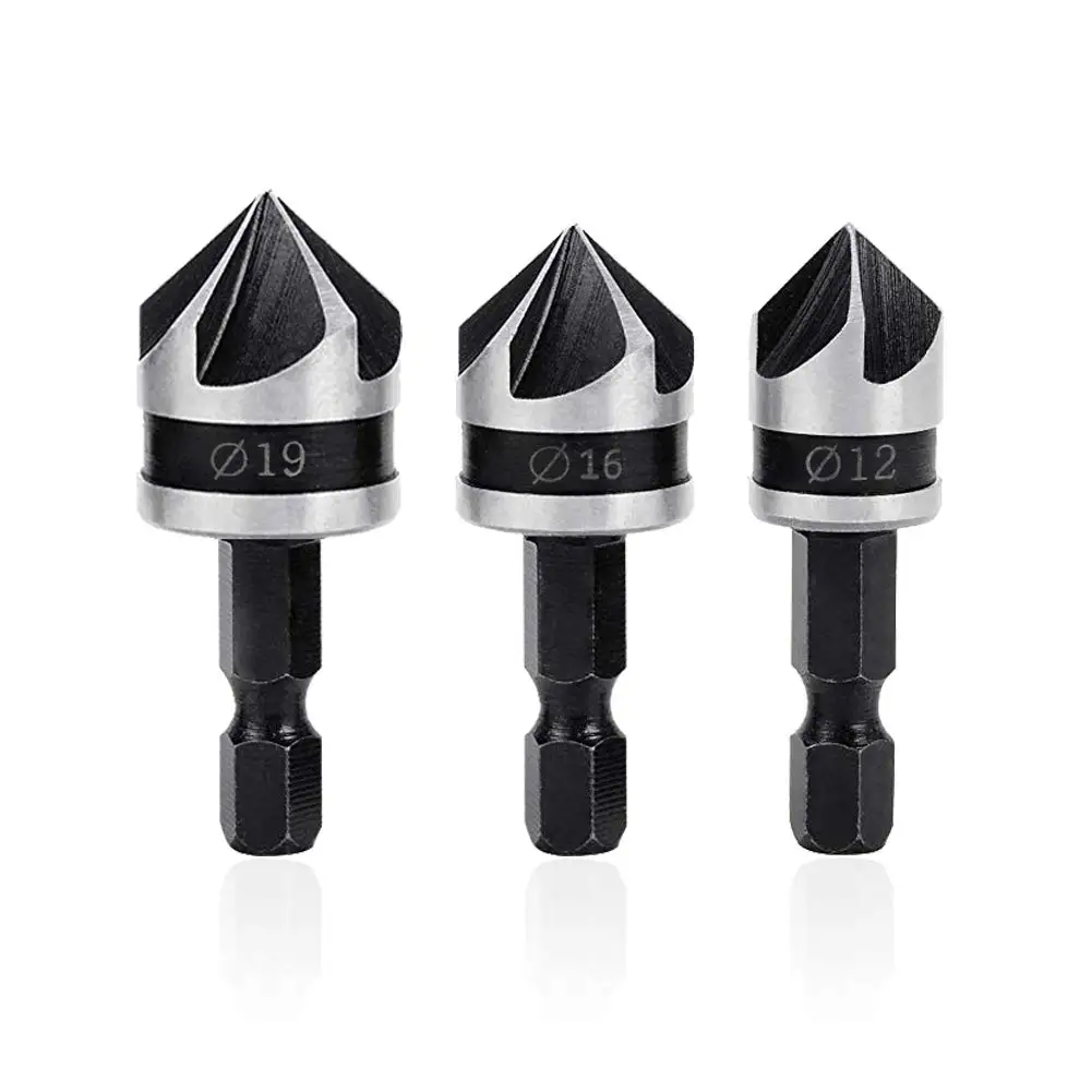 3 шт. 1/4 "Hex 12/16/19 мм зенковки бит набор сверл: пятивальный трехстоечный станок для быстрой смены для леса из металла