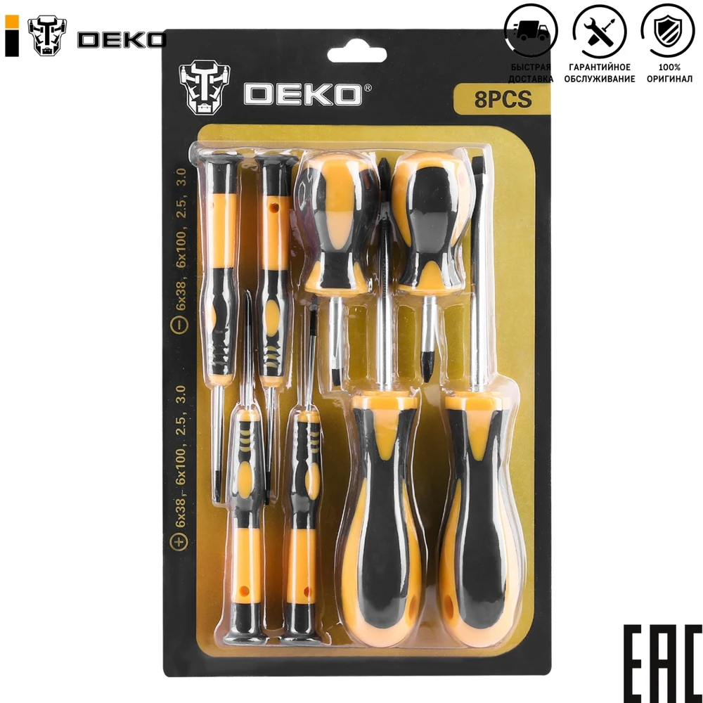 Набор отверток DEKO SS08 (8 предметов) предназначен для выполнения монтажных и демонтажных работ с различными резьбовыми соединениями. В набор входят:PH6x38, 6x100; SL6x38, 6x100