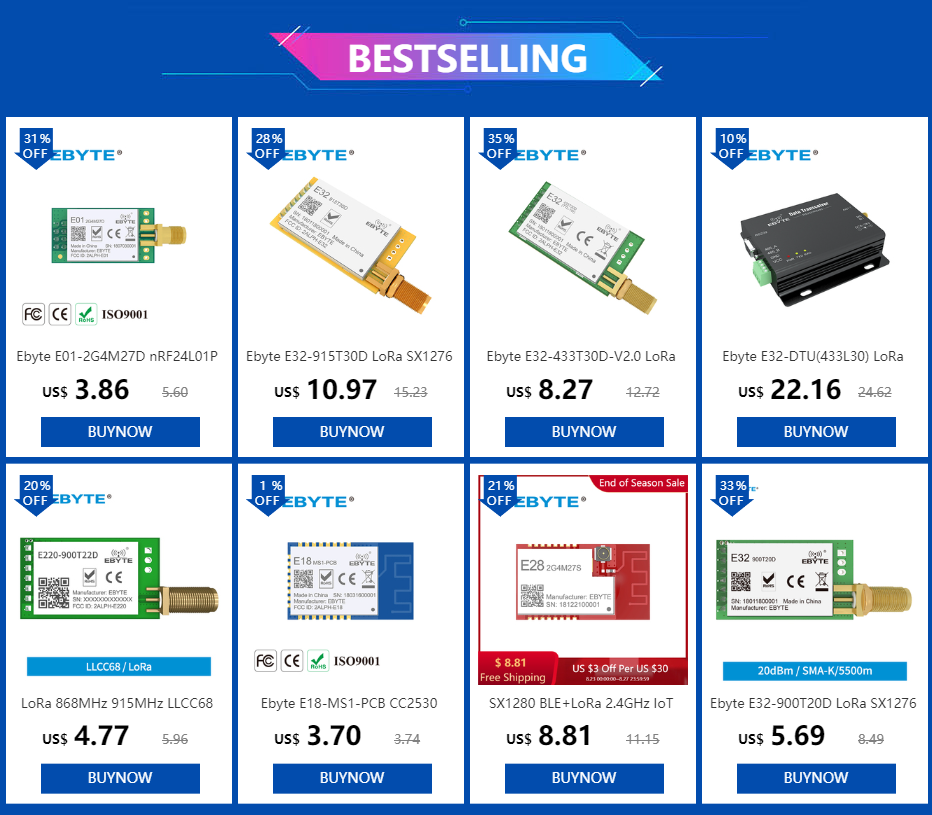 Магазина CDEBYTE IoT Module Store работает с 20.11.2019. его рейтинг составлет 96.8 баллов из 100. В избранное добавили 1899 покупателя. Средний рейтинг торваров продавца 4.9 в продаже представленно 1005 наименований товаров, успешно доставлено 3919 заказов. 1031 покупателей оставили отзывы о продавце.