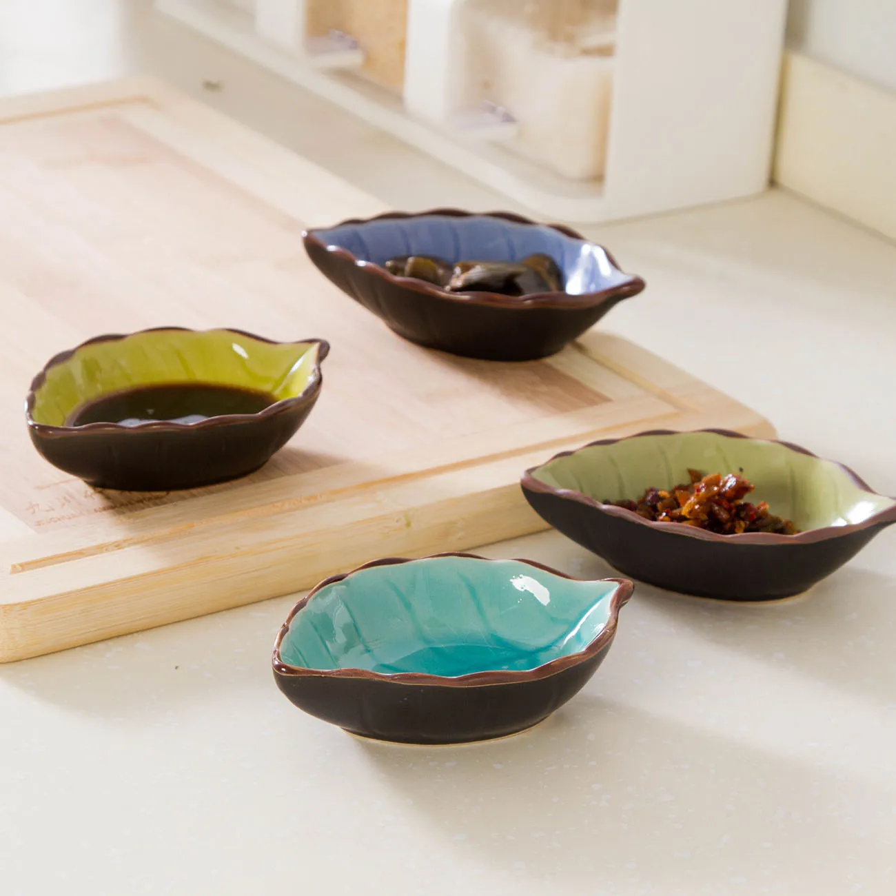 Японская приправа, уксус, соус, блюдо, суши, блюда, закуски, кухня, креативные листья, керамические тарелки, посуда, поднос для приправ