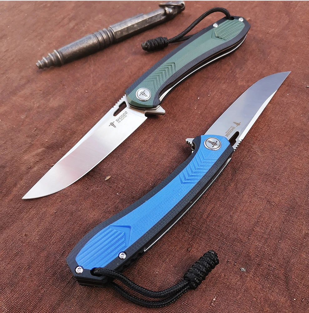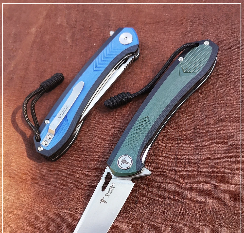SHOOZIZ KNIFE Product name: High hardness folding knife Product type: Outdoor folding knife Hardness: 59HRC Edge type: smoothness Blade: <60° Brand: SHOOZIZ Model number: XUN110 The blade material: D2 Overall length: 20.3cm Blade′s length: 9cm Blade width: 2.25cm Blade thickness: 0.32cm Handle material: G-10 Handle length: 11.5cm Color: Black and green/Black and blue Usage: Left hand/right hand Open the way: Help fast open Usage: Left hand/right hand Spindle system: Double row ball system The net weight: ≈105g Range of application: Outdoor sports,self-driving trivel,gift tools,collection,ETC