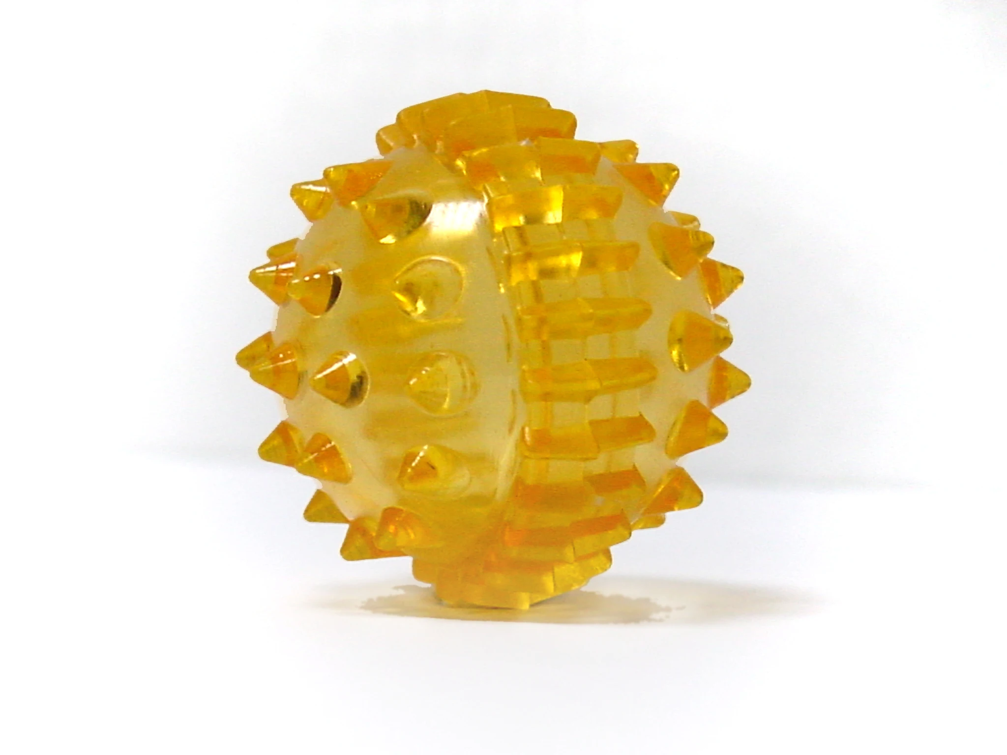Массажер Ежик представляет собой шарик с небольшими пластмассовыми шипами умеренной остроты, внутри которого находится пружинка, которая эффективно помогает массировать пальцы и межпальцевые промежутки.