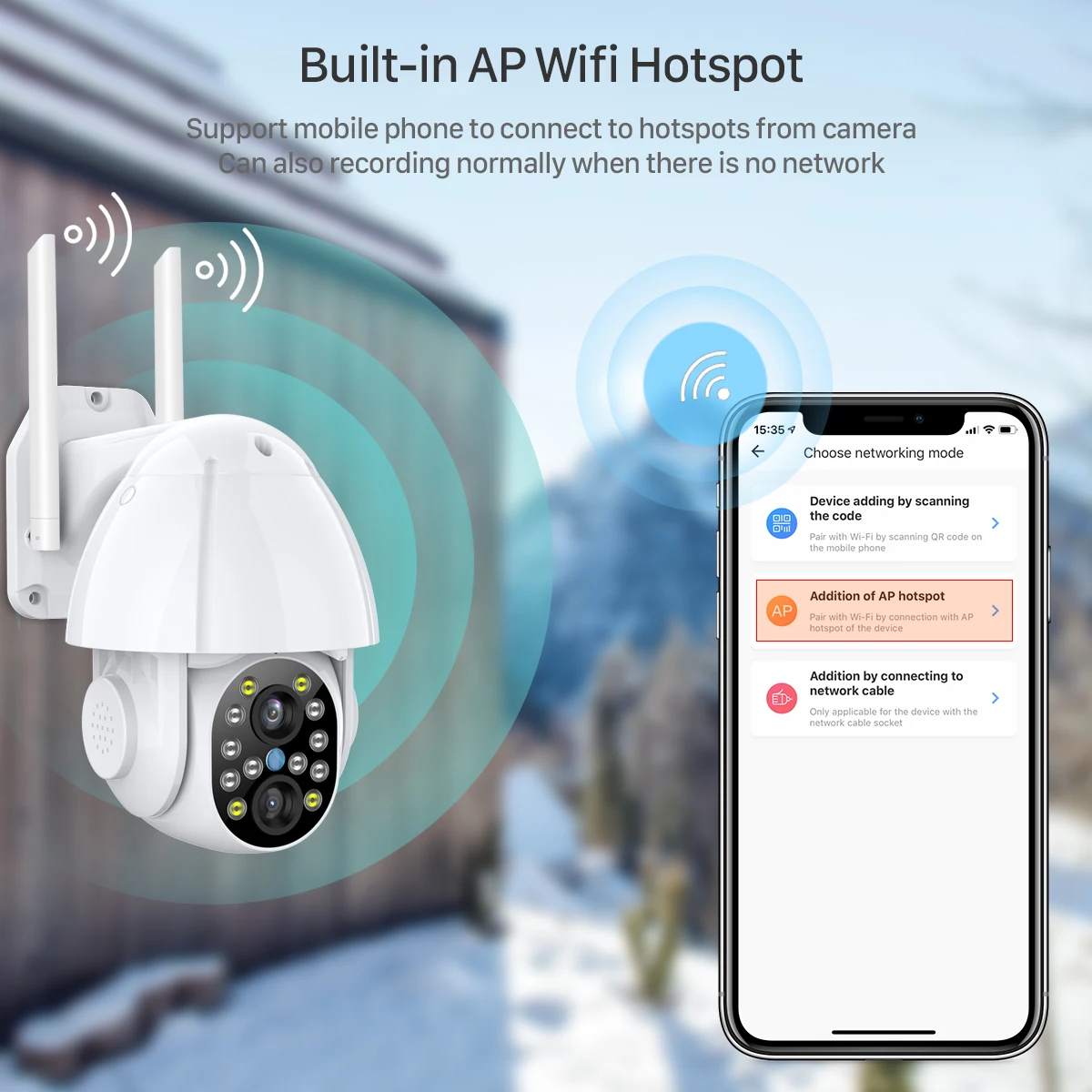 Что делать, если ваша камера отключится от сети? Не волнуйтесь, наша камера имеет встроенный AP wifi, вы все еще можете подключиться к AP wifi камеры, чтобы просмотреть его около 20 м.