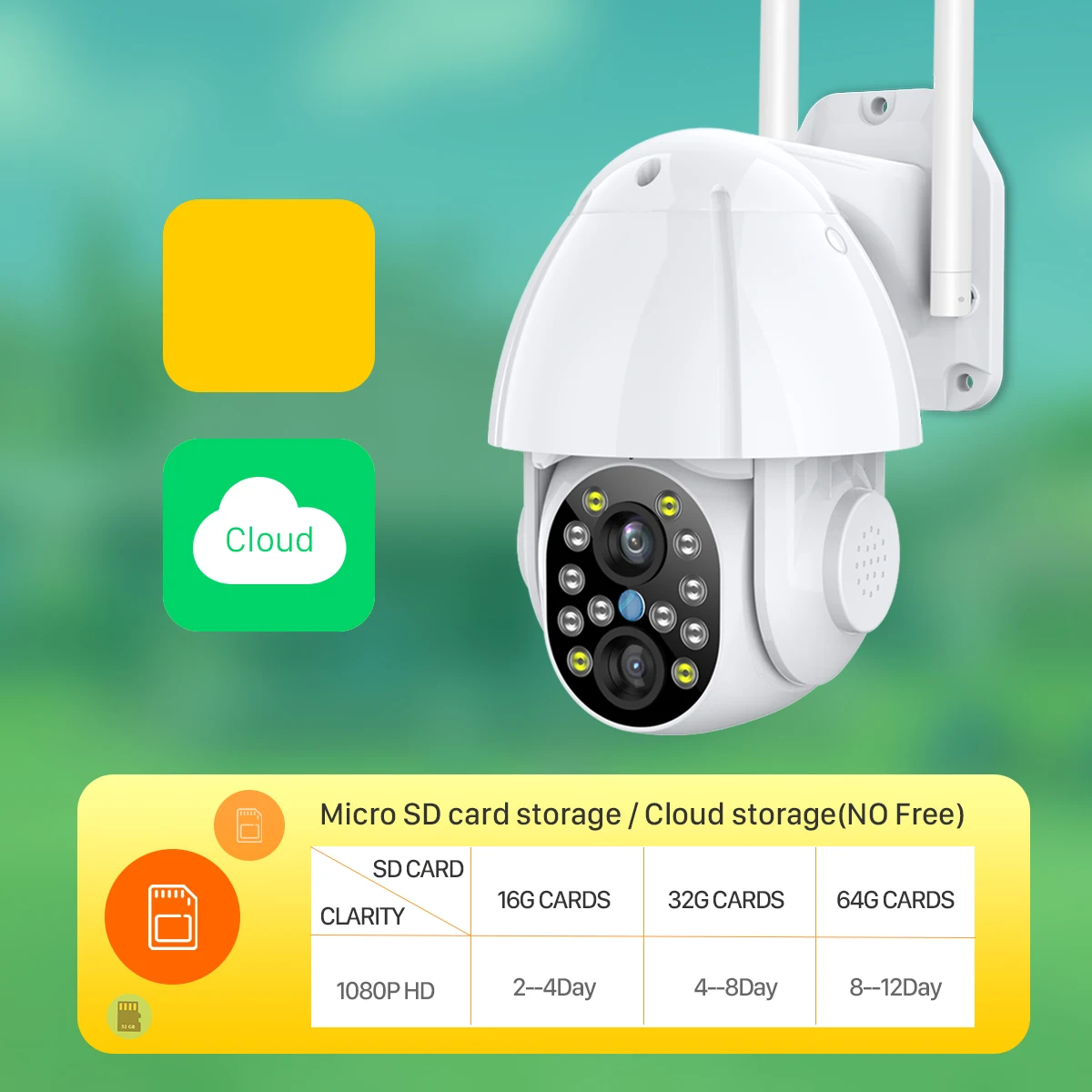 Поддерживает TF карту до 128 ГБ и предоставляет Облачное хранилище (необходимо оплатить дополнительные расходы), вы можете выбрать либо или оба, чтобы сохранить ваши записи и избежать риска потери видео с карты.