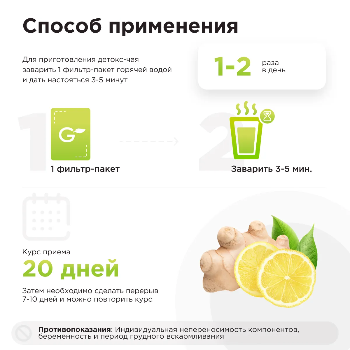 Чай Detox Herbal Tea Имбирь-Лимон – это эффективное средство очищения. 100% натуральные травы, экстракты растений, фрукты и специи выводят из организма все шлаки и токсины, а также нормализуют работу пищеварения, печени и почек. Имбирный чай с лимоном обладает мягким слабительным действием, что особенно важно при комплексном подходе к похудению и очищению организма.