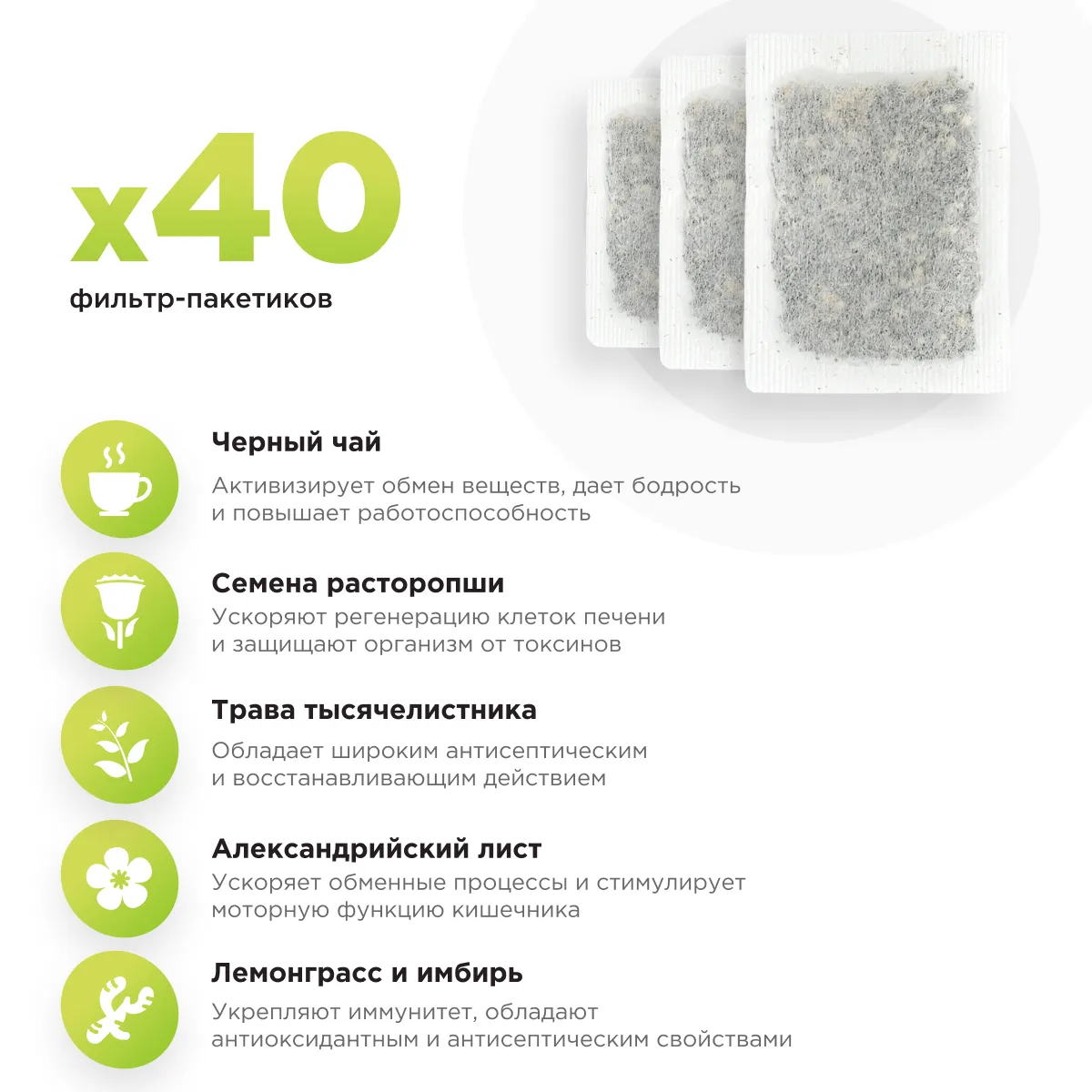 Состав: чай черный, лимонная трава, цедра апельсина, трава тысячелистника, семена расторопши, александрийский лист, имбирь сушеный, пищевой ароматизатор «Лимон».