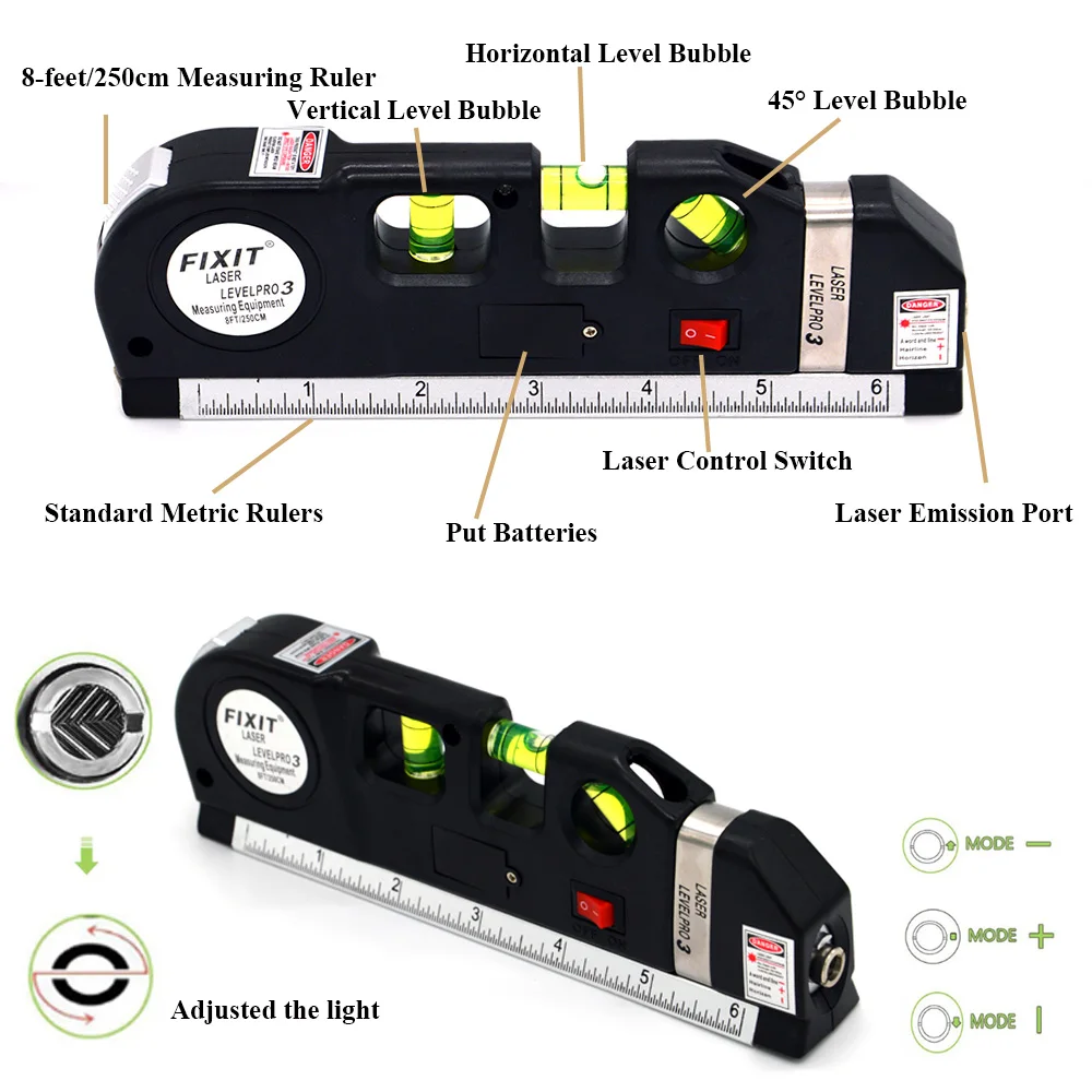 Третья функция: лазерный нивелир с линейкой. (2,5 метров, с дюймовой шкалой)