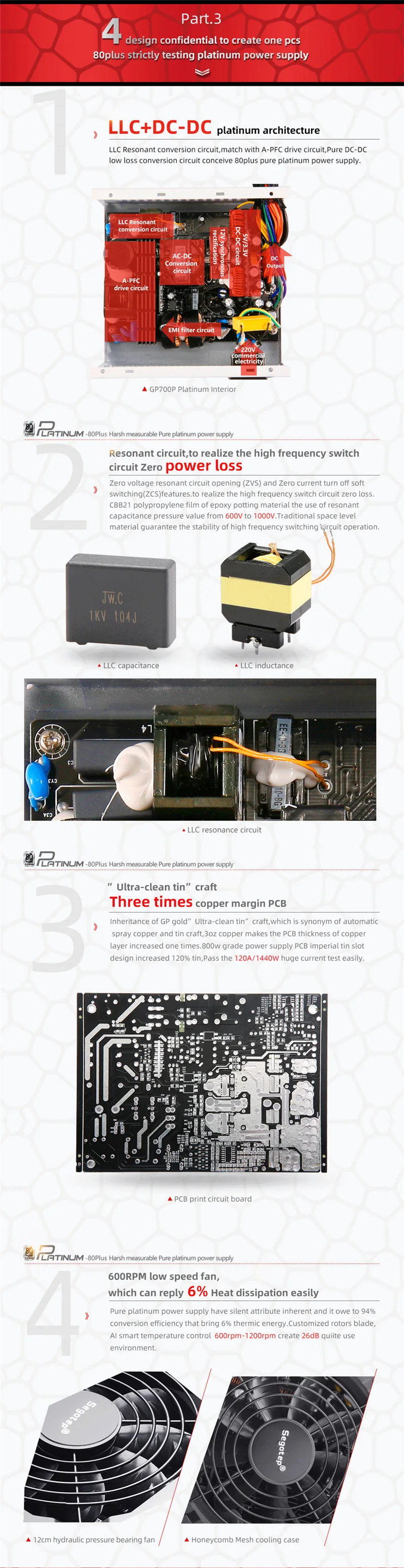ООО резонансная конверсия цепи, матч APFC Крис цепи. Чистый DC-DC низкое преобразование цепи зачатие 80 плюс чистый Платиновый источник питания. Реализовать высокочастотный переключатель цепи нулевой потери мощности. "Ультра-чистый Олово" ремесло, 3 раза медь маржа PCB. Низкоскоростной вентилятор 600 об/мин, который может отвечать на рассеивание тепла на 6%.