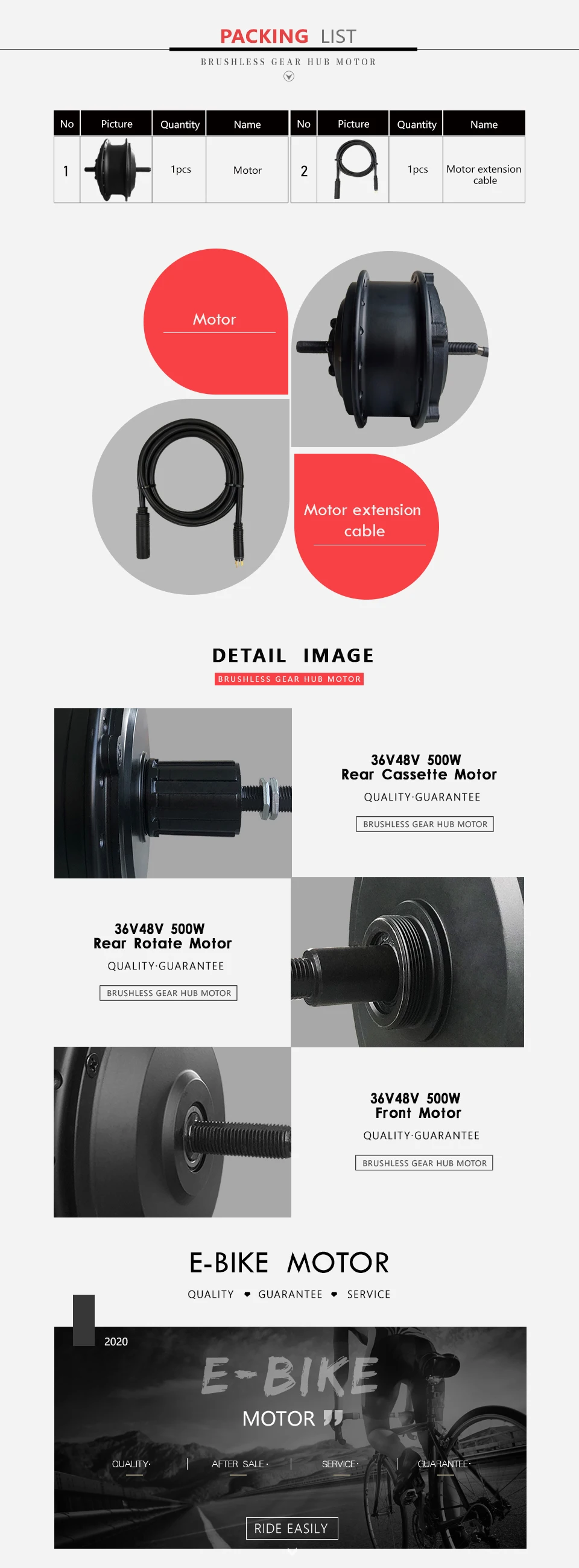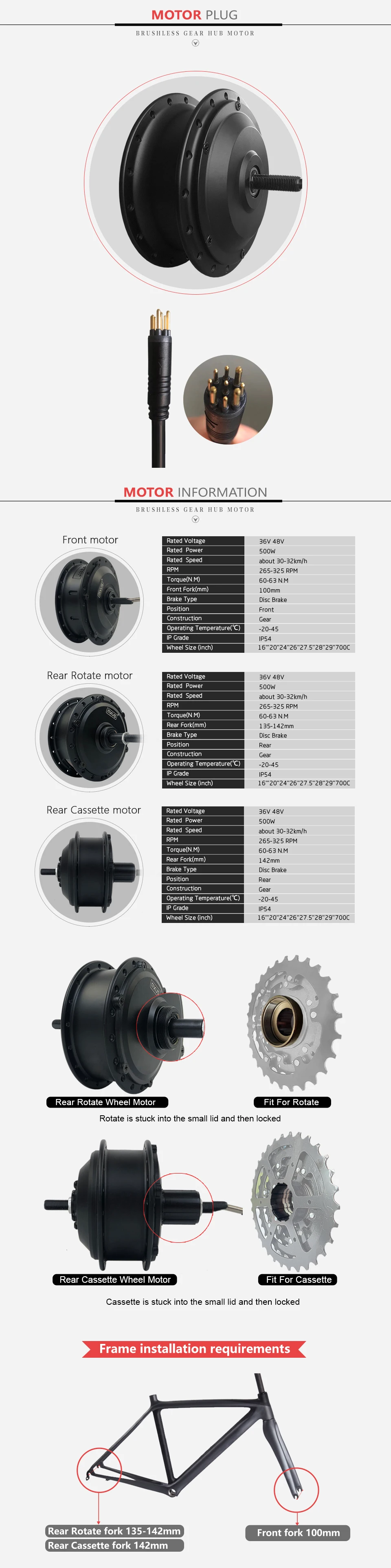 ◆ Номинальное напряжение:36V/48V◆ Номинальная мощность:500 Вт◆ Номинальная скорость:Около 30-32 км/ч◆ Об/мин: 265-325 об/мин◆ Крутящий момент (Н. М):60-63 Н. М◆ Задняя вилка (мм):135-142 мм◆ Тип тормоза:Дисковый тормоз◆ Положение:Задний◆ Конструкция:Шестерня◆ Рабочая температура (℃):-20-45Класс IP:IP54◆ Размер колеса (дюйм):16''20''24''26''27.5''28''29''700C【 500 Вт Задняя кассета Motor】