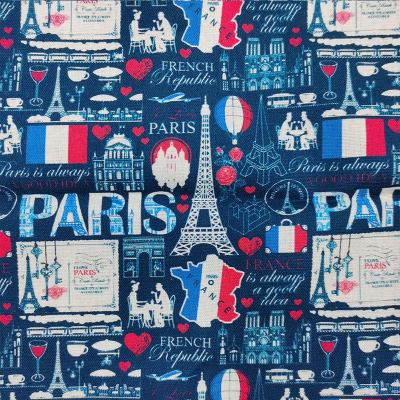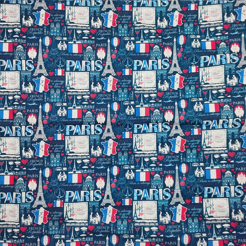 Товар: синяя ткань для платья с принтом Эйфелевой башни «Париж», 100% хлопок