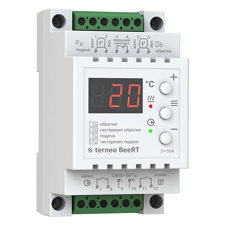 Терморегулятор terneo BeeRT позволяет управлять нагревом электрического котла. Кроме того, он оптимизирует и контролирует работу циркуляционного насоса, благодаря чему защищает котел и систему трубопроводов от перегрева.