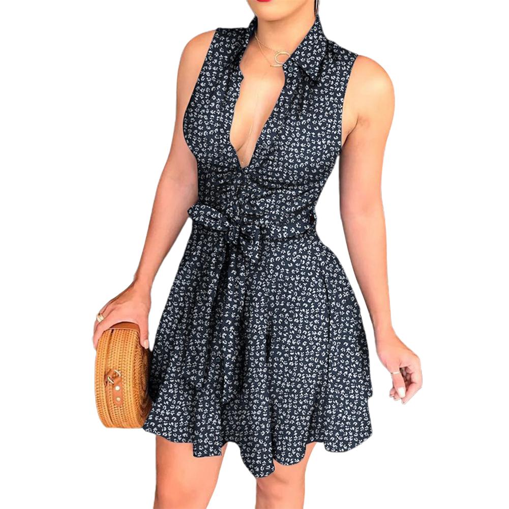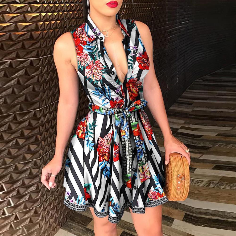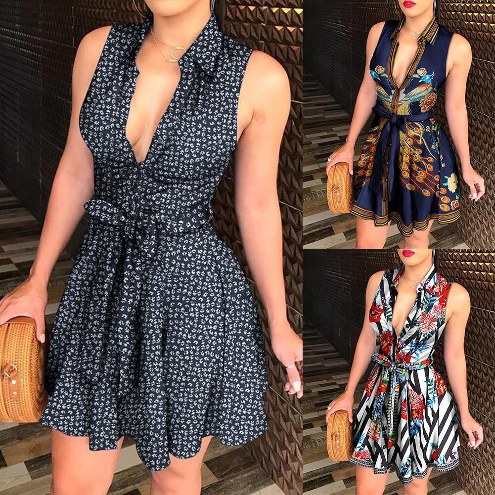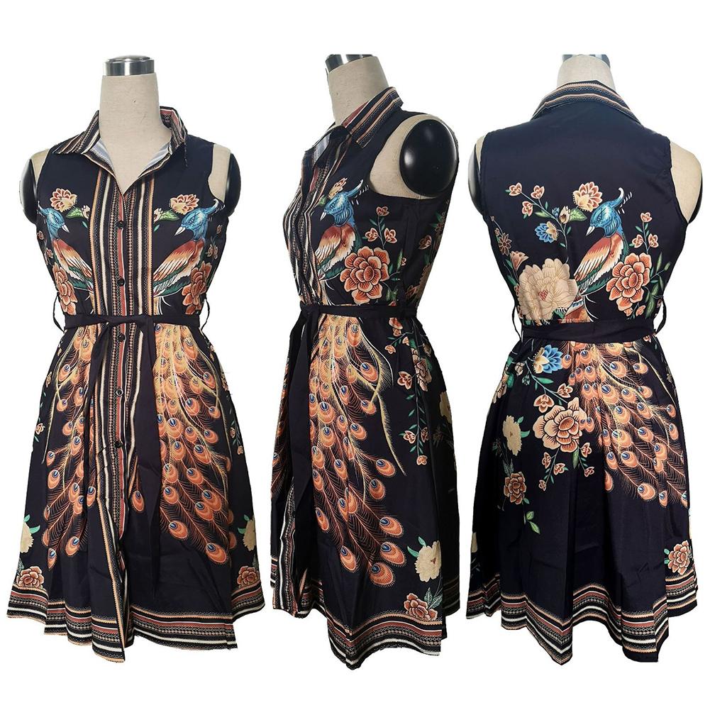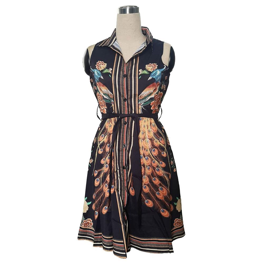 Женское сексуальное мини-платье с отложным воротником без рукавов с принтом павлина и поясом