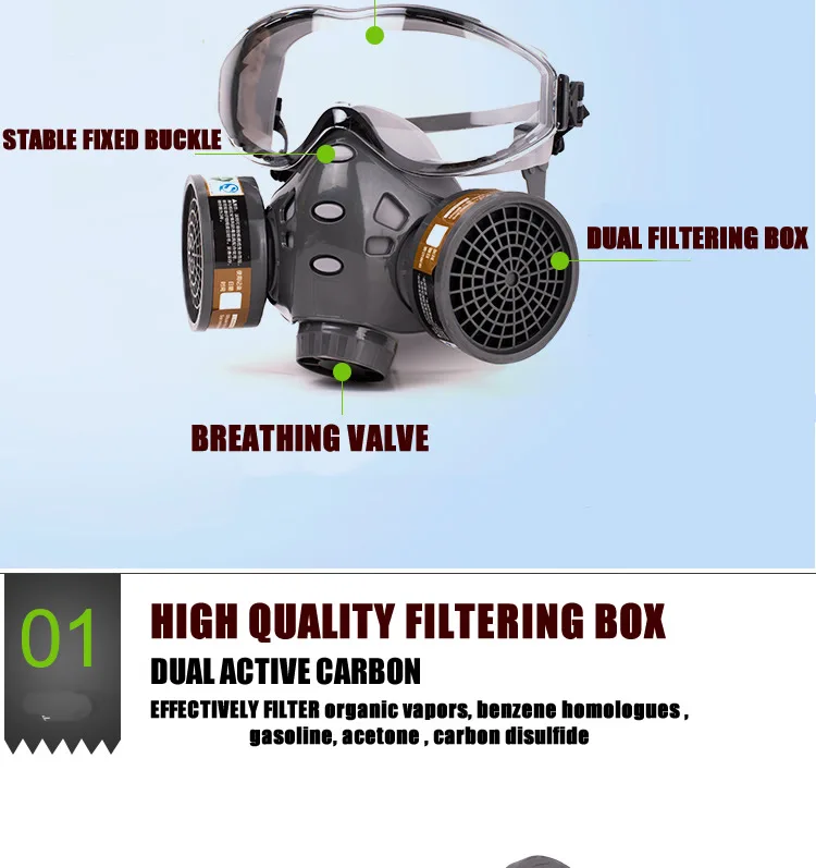 Suitable for preventingorganic vapors, benzene homologues , gasoline, acetone , carbon disulfide et