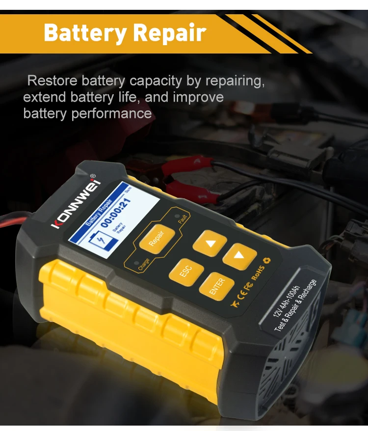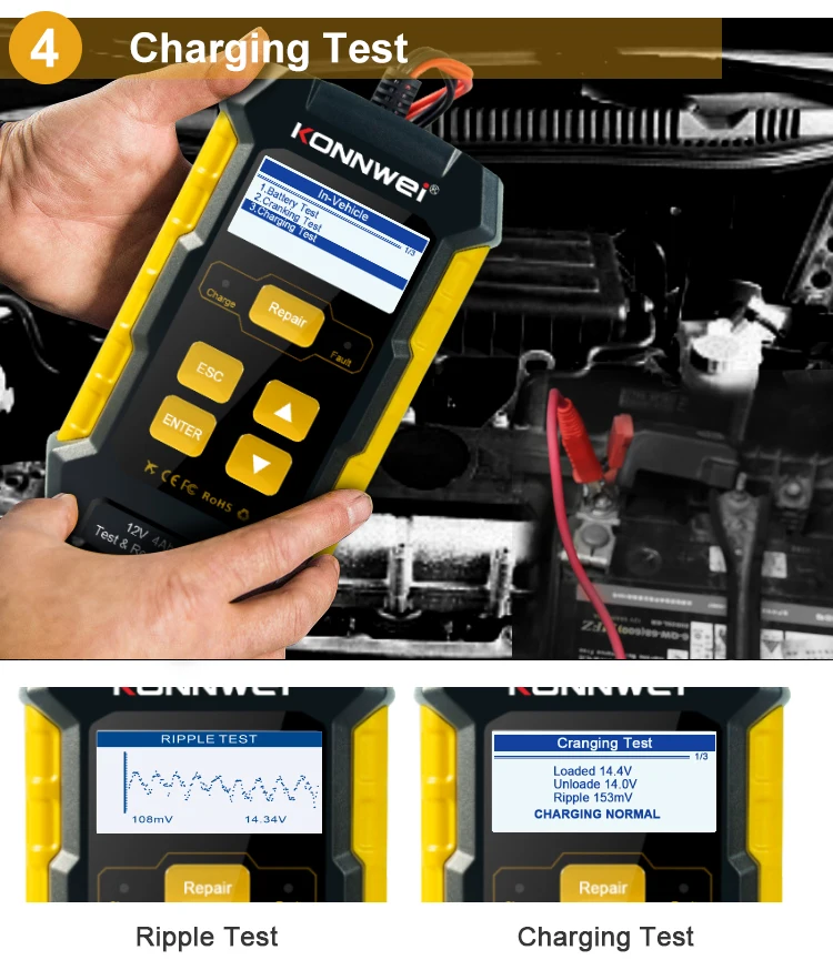 KW510 автомобильное зарядное устройство преимущества: Работает на 12 В свинцово-кислотных батареях. Импортный чип STM32103VCT6. Результаты тестирования графического аккумулятора. Хранение и обзор результатов тестирования. Поддержка 8 языков: английский, французский, немецкий, голландский, испанский, португальский, русский и итальянский KW510 автомобильный тестер батареи Применение: Все 12V свинцово-кислотная батарея бензина, дизельное топливо, гибридные электрические автомобили и аварийные аккумуляторы. Стандарт автомобильного аккумулятора: CCA:100-2000 BCI:100-2000 CA:100-2000 MCA:100-2000 JIS:26A17-245H52 DIN:100-1400 IEC:100-1400 EN:100-2000 SAE:100-2000 Посылка: 1 х зарядное устройство KW510 1 x зарядный кабель 1 x Руководство пользователя