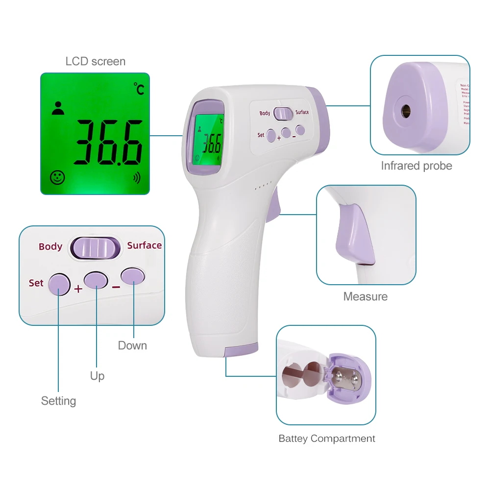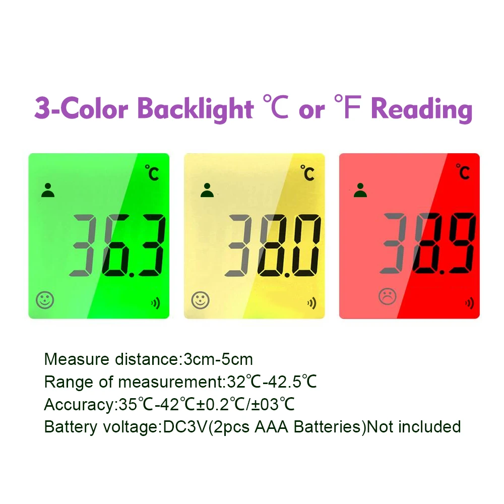 ЖК-дисплей с 3-цветной подсветкой: цвет подсветки будет варьироваться в зависимости от измеренной температуры, зеленая подсветка для нормальной температуры, внимание к вашей температуре и красный для сигнализации о лихорадке