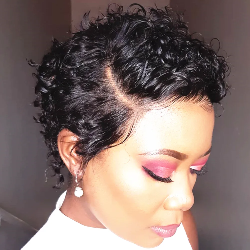 Brand: Stylistlee Material: human hair Hair style: Pixie Short Curly hair Wig Color: 99J /Natural black Length: 8-10 inches Density: 130%/150%/180% Wig category: T Part Human Hair Wig Quantity: 1pcs