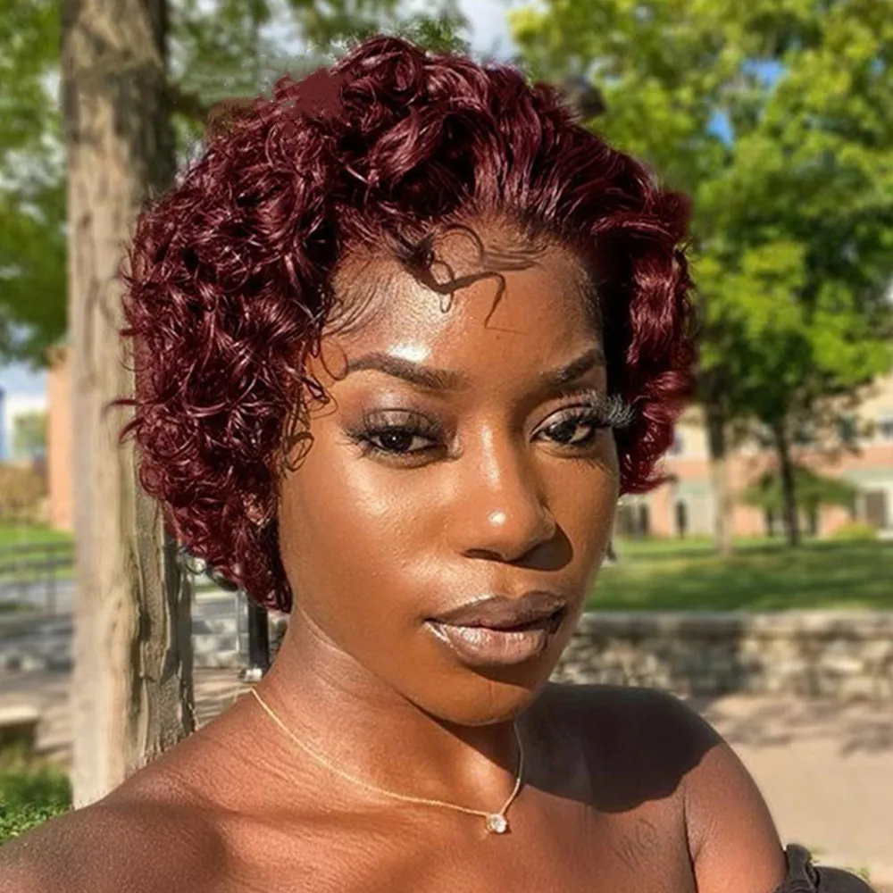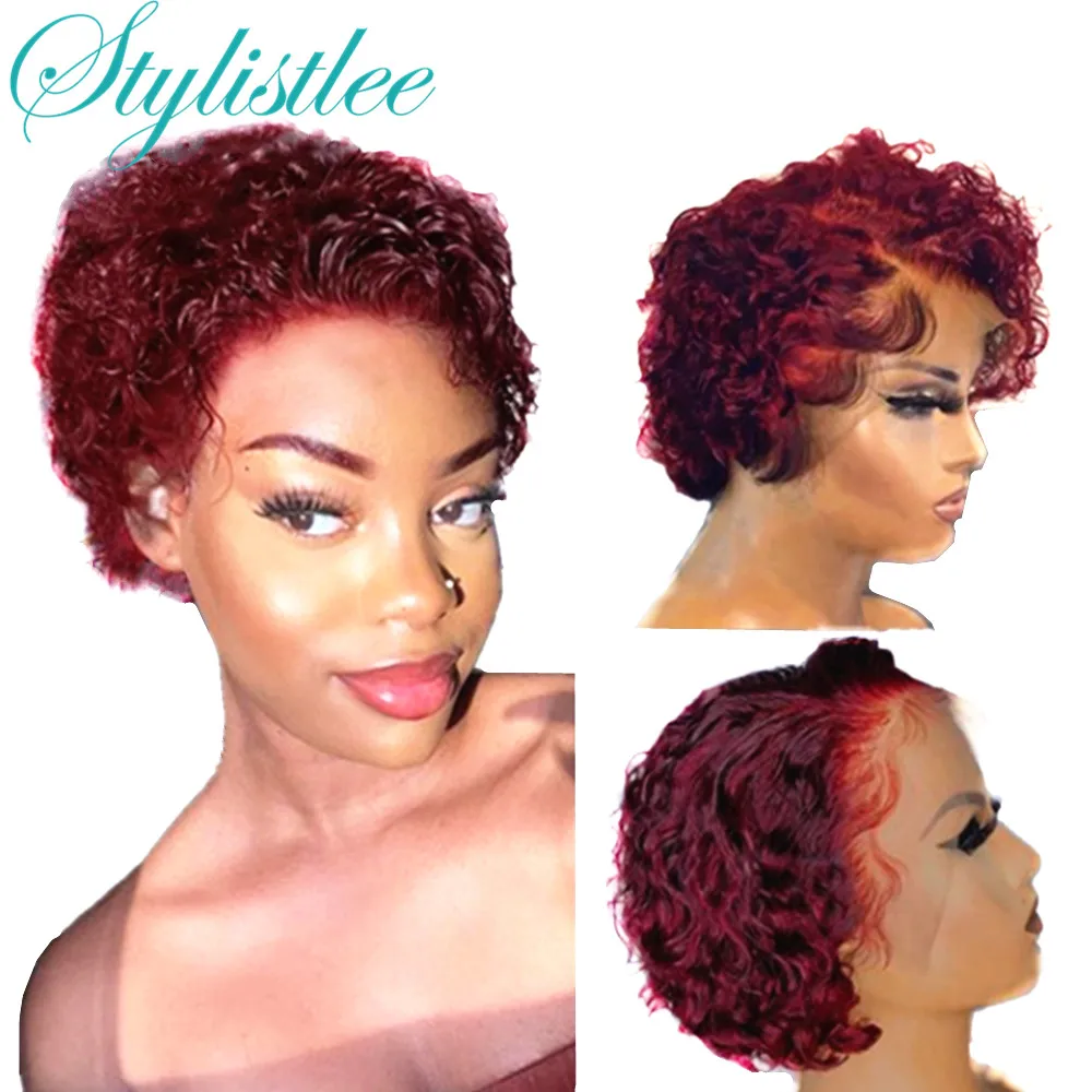 Stylistlee Pixie Wig Bob 99J Red Short Curly T Part Human Hair Lace Front Wigs Pixie Cut Wig For Women Colored Highlight Natural black Wig Factory Shop
