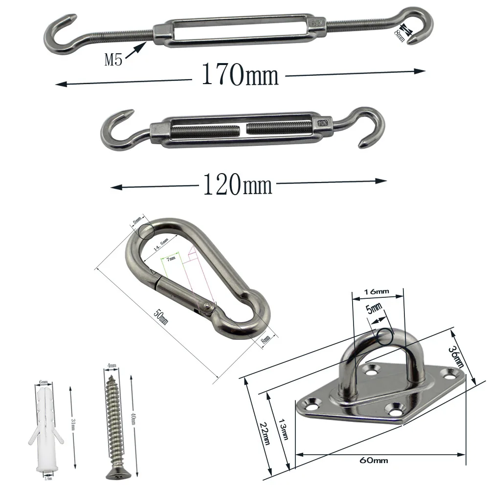 Использование:Этот товар представляет собой набор подходящих комплектов для навесного паруса. M5 ромбовидная Накладка для глаз используется для создания точки крепления на здании или дереве. Используется стяжная муфта ОС M6 Для натяжения веревки. Крючок M5 используется для прикрепления угла паруса к точке крепления. Самонарезающий винт используется для фиксации накладки на здание или Дерево.