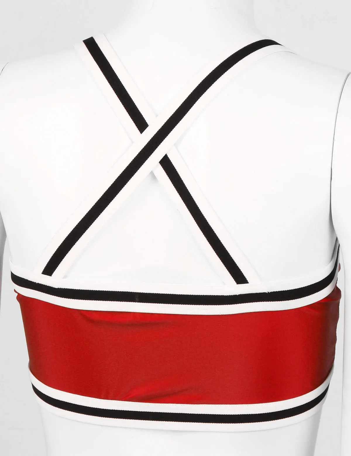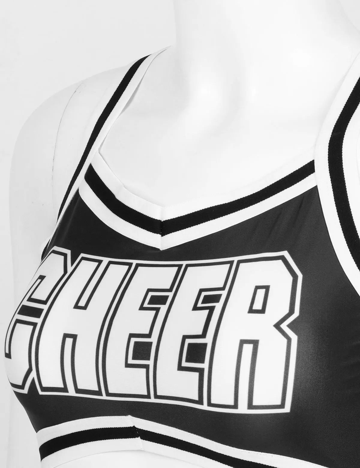 V neckline and sleeveless, elastic striped shoulder straps cross at back, printed "CHEERS" letters in the front.