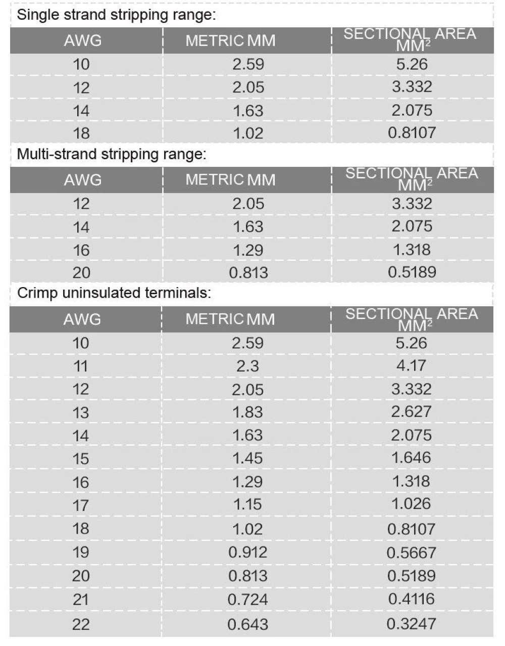 Диапазон зачистки: одна часть: 10,12,14 18awg несколько акций: 12,14,16 20awg