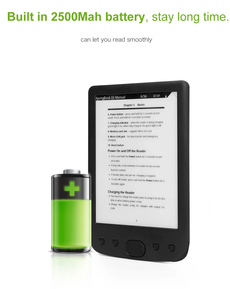 Встроенный аккумулятор 2500 мАч, длительный срок службы батареи Поддержка tf-карты, увеличение объема чтения 6 дюймов маленький и портативный Ежедневный Водонепроницаемый Название продукта: устройство для чтения электронных книг Модель: BK6025 Тип дисплея: E-ink 4:3 Vizplex Материал: пластик Язык системы можно установить на китайский, английский, немецкий, французский, испанский, турецкий, русский, португальский, японский, индийский, корейский, тайский, малайский, итальянский, арабский, украинский, польский, голландский, румынский и так далее более 30 языков