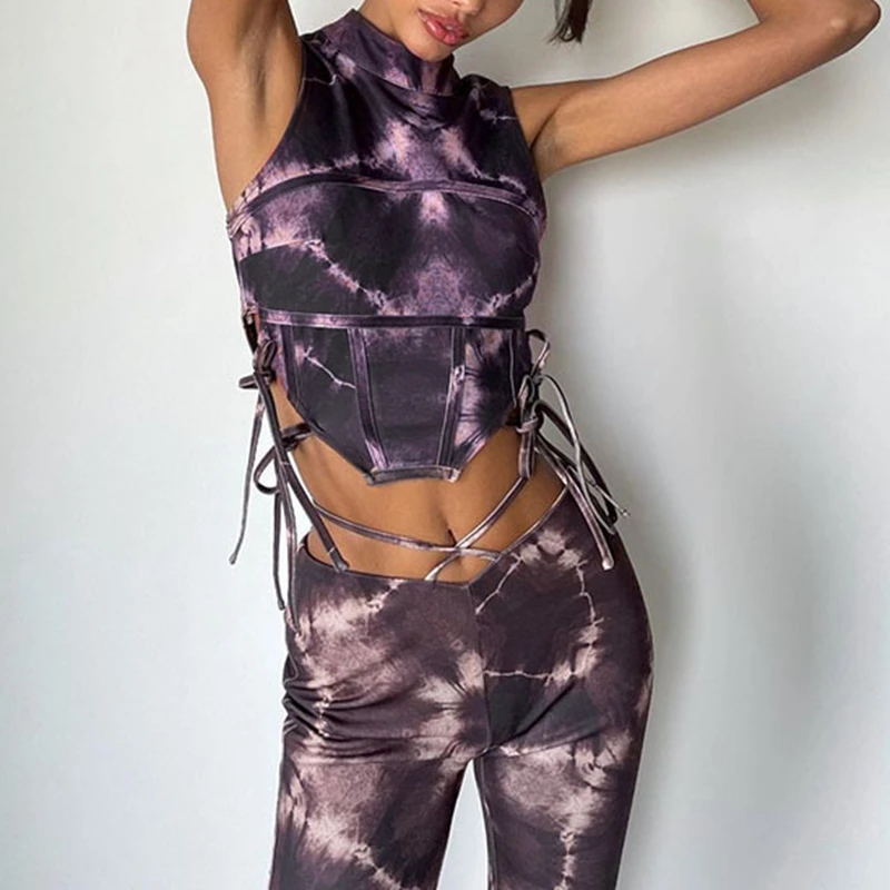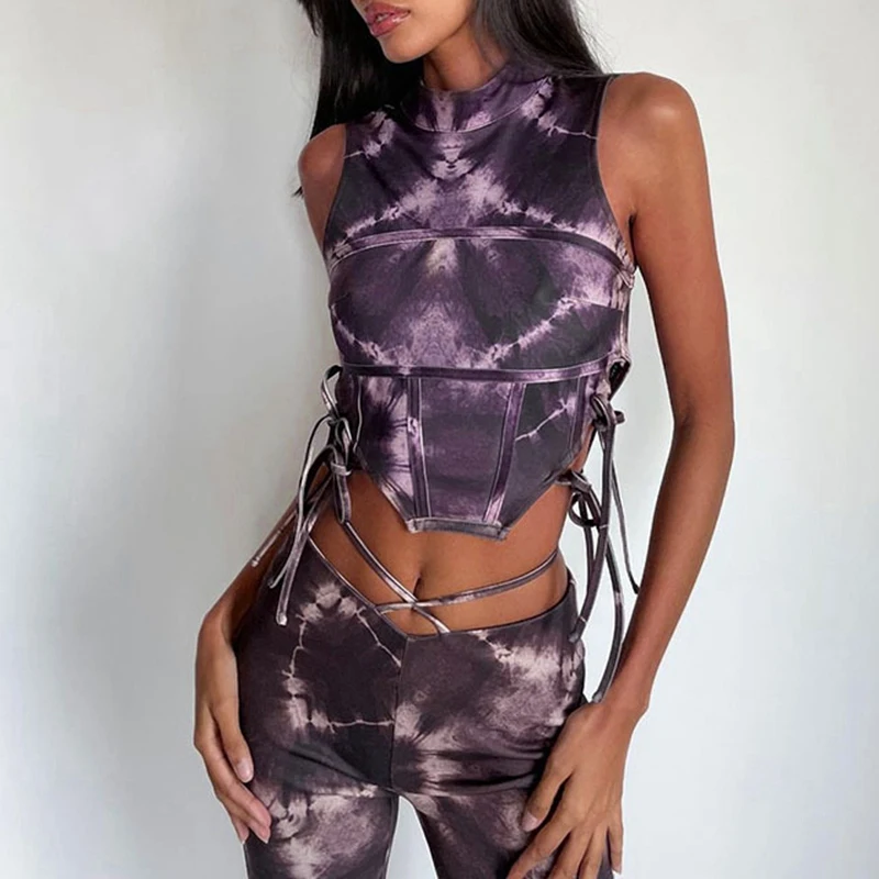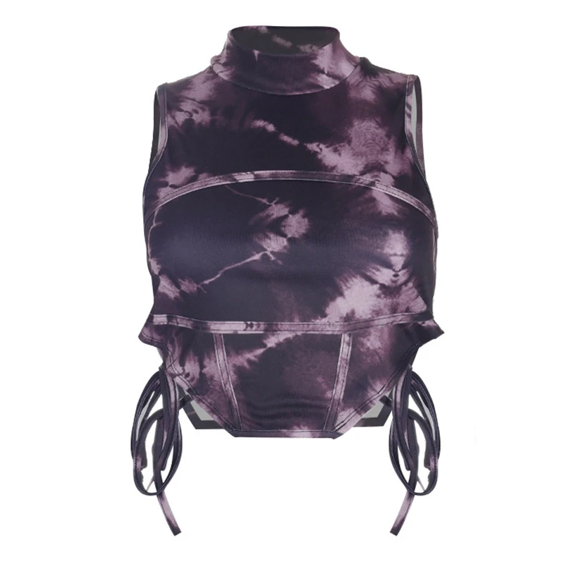 Открытая спина без рукавов галстук-краска нерегулярные сексуальные кружева Топ Лето Женская мода клуб наряд