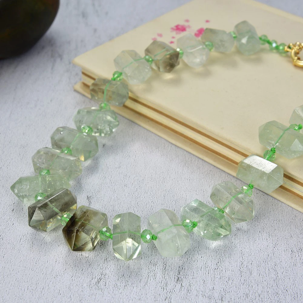 Описание ювелирных изделий Информация о драгоценных камнями: граненый зеленый аметист прразилит двойной концевой, Круглый прегнит, хорошее качество, высокий блеск!Диаметр: 12x26-13x31мм (зеленый аметист прасиолит), 6 мм (прегнит).Длина: 19 ''(ожерелье).Застежка: 18 K GP, застежка |