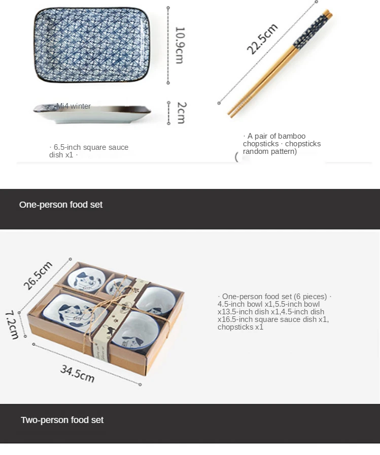 Набор еды для одного человека (6 шт.) · миска 4,5 дюйма x 1, миска 5,5 дюйма x блюдо 13,5 дюйма x 1, блюдо 4,5 дюйма x квадратное блюдо 16,5 дюйма x 1, палочки для еды x 1
