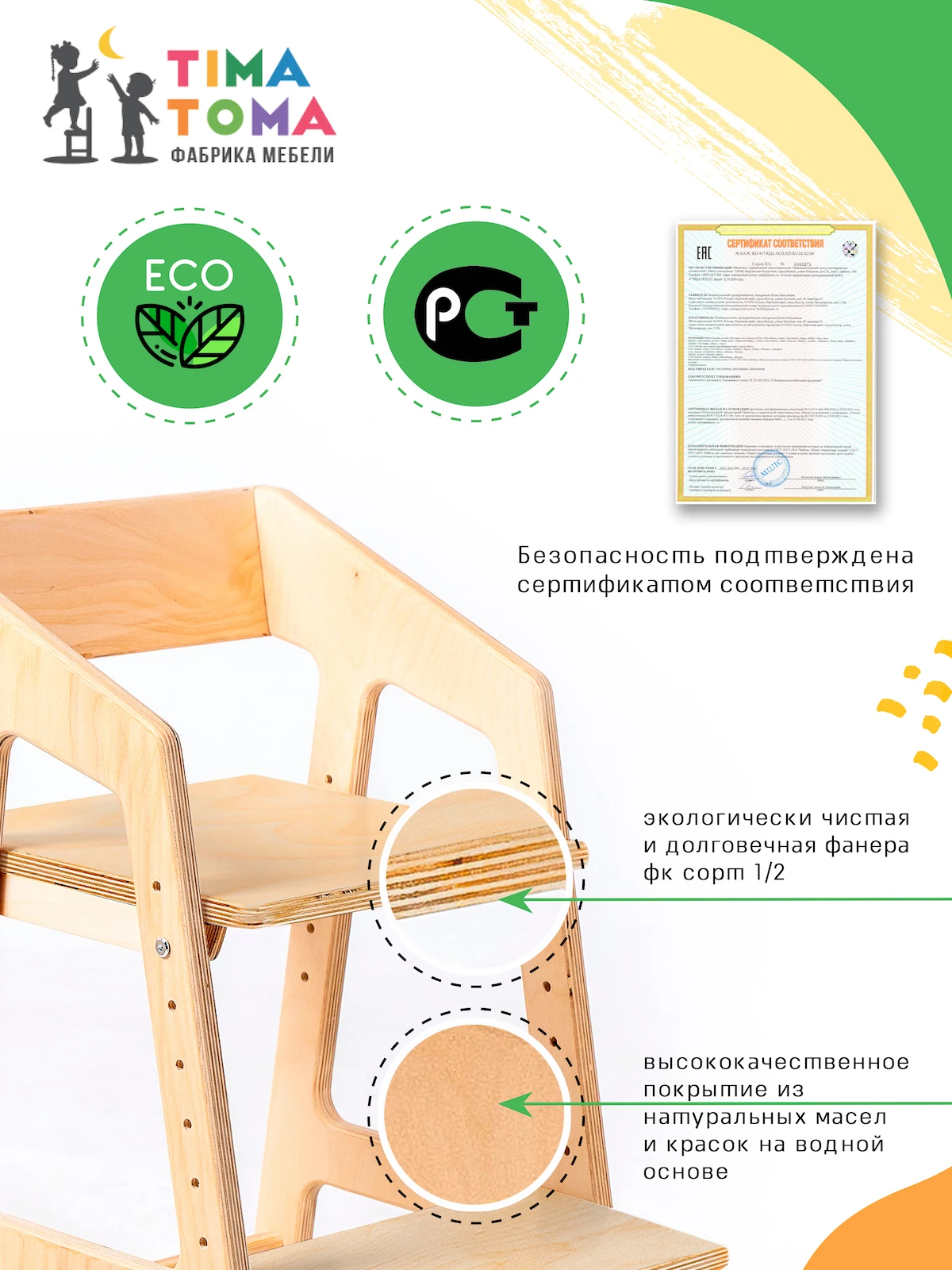 - Стул «Тима Тома» изготовлен из экологически чистой березовый фанеры (класс эмиссии Е1) и покрыт тиковым маслом, что повышает влагостойкость и придает дереву приятный оттенок. Сиденья покрыты краской на водной основе, не содержащей вредных веществ, производство Италия.