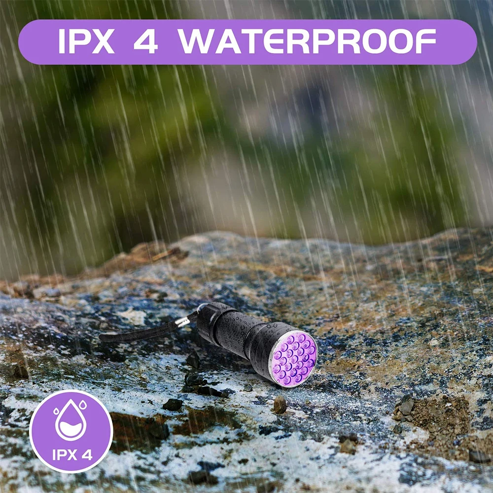 > IPX 4 Водонепроницаемость: черный светильник для обнаружения мочи домашних животных является водонепроницаемым IP4, выдерживает брызги даже в дождливые дни. Не помещайте ультрафиолетовый фонарик прямо в воду. Он рухнет, когда полностью под водой.
