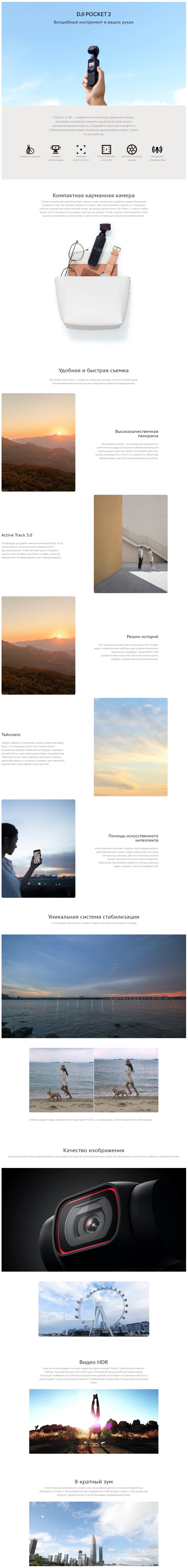 Карманный и портативный DJI Pocket 2 - это маленькая камера, которая позволяет вам в одиночку записывать памятные моменты. Pocket 2 оснащен стабилизатором движения для создания четких фотографий и плавных видеороликов, что дает вам возможность творить волшебство своими руками.