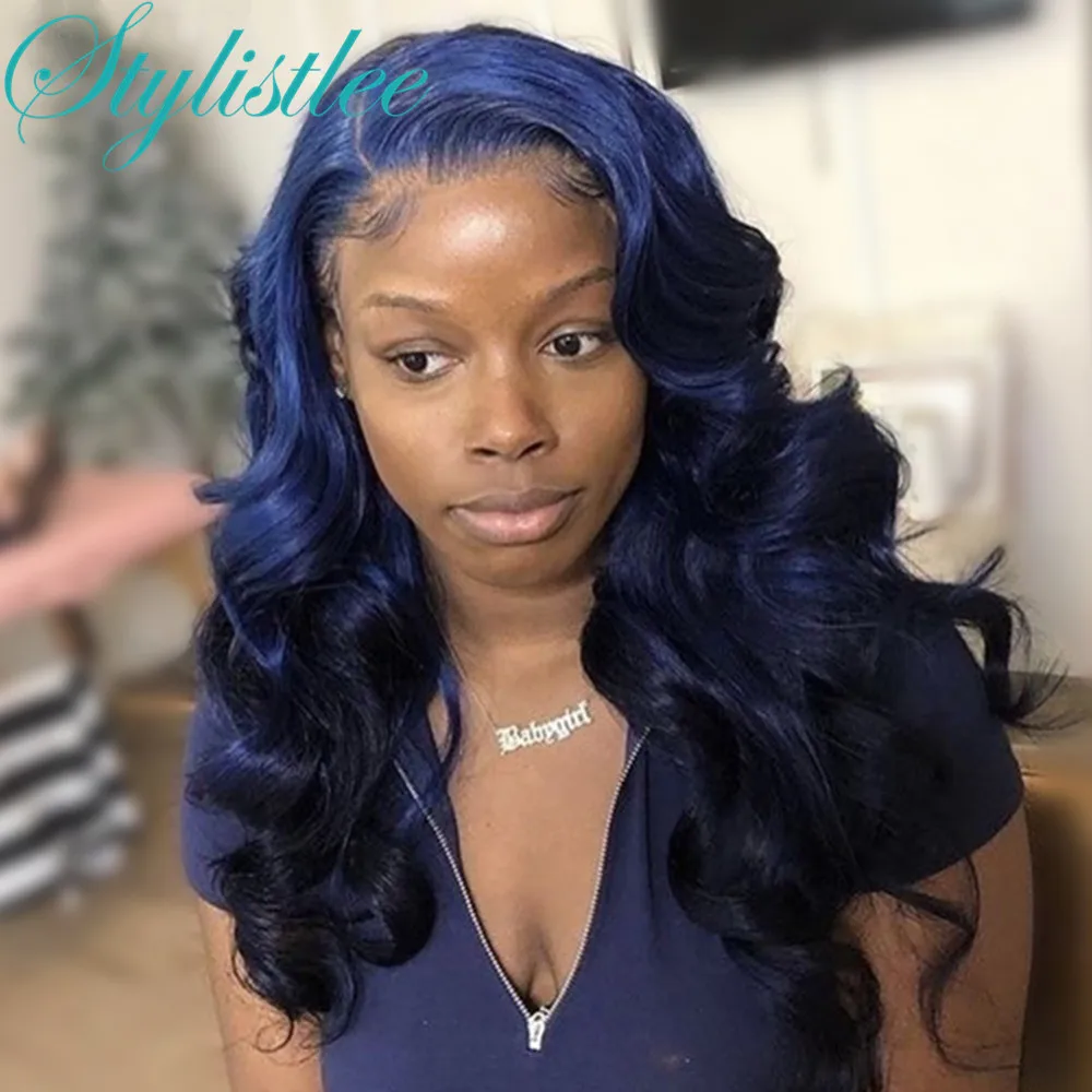 Stylistlee темно-синий 13x4 кружевной передний парик, цветные человеческие волосы, парики для женщин, бразильские волосы, парики для тела, Т-образная часть, кружевной передний парик, предварительно выщипанные волосы
