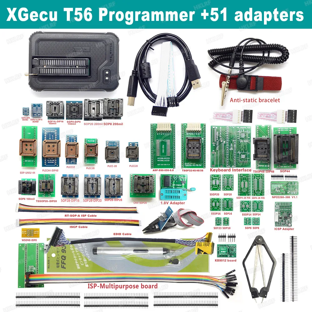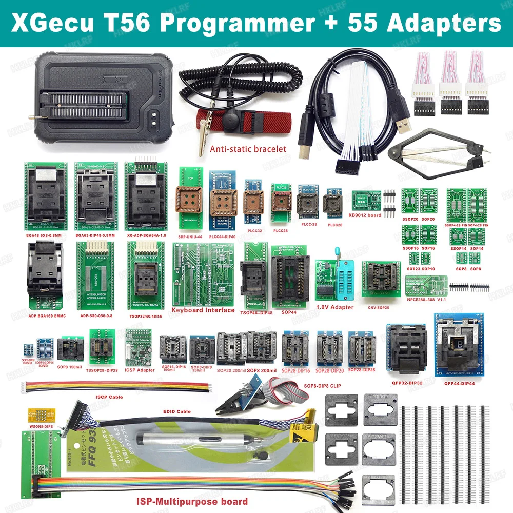 XGecu T56 programmer-это 56-контактный полноприводный программист, который является общим для всех чипов в той же посылка в пределах 56 контактов. Каждый адаптер имеет четкую подсказку в программном обеспечении, Функция проверки контактов расположена к контактному номеру чипа