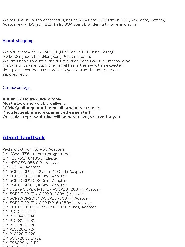 Пример: Обычный адаптер TSOP56, который может программировать все TSOP56, TSOP48, TSOP40, TSOP32 на t56. Один TSOP56 адаптер эквивалентен удобный емкостный Мини-стилус, служащий также в пяти адаптеры для данного товара 48-pin Универсальный программатор.