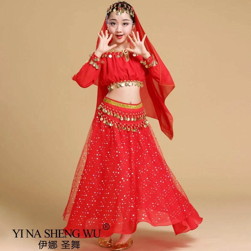 Модный новый стиль, детский костюм для танца живота, индийский танцевальный костюм, сари, Болливуд, детская одежда, комплекты одежды для танца живота