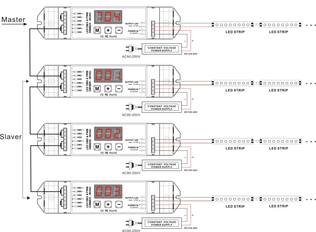 Welcome to use the DMX512 Constant Voltage Decoder which is developed only for constant voltage LED lamps. It adopted advanced micro-computer control technology to transfer standard DMX512/1990 signal to PWM signal.One channel output,max 10A output each channel, 4096 Grey Scales. It can be used as DMX512 master or as DMX decoder to connect computerized digital output consol with analog silicon case and controls LED lamps of architecture and lighting.