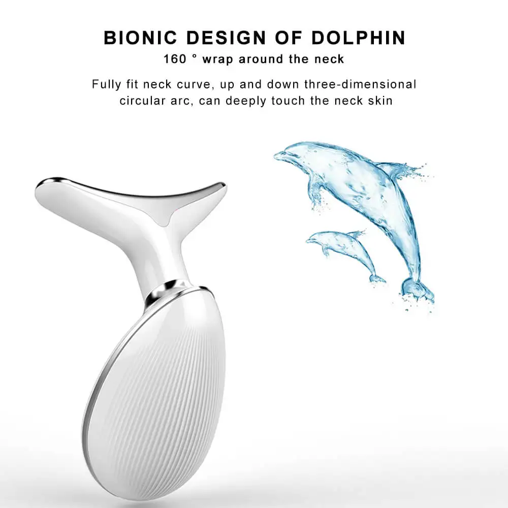 1.The streamlined massage head is specially designed for the neck. The streamlined design conforms to the ergonomic theory and transmits energy to every inch of the neck. 2.The massage head's 45-degree warm skin rejuvenation is combined with three color sound wave modes of low, middle and high, and blue / green / red color massage. Promote blood circulation, stimulate acupuncture points on the face and neck, dredge meridians, improve circulation and promote metabolism, promote the discharge of long-standing waste toxic substances, slow down the aging of epidermal cells, reduce the appearance of neck lines, reduce puffiness, relax shoulders and necks, acupoint physical therapy, Quickly eliminate fatigue and restore physical fitness. 3.The three sonic vibration modes are: low speed (blue light) / medium speed (green light) / high speed (red light). Touch the switch to turn on, every time you press to switch the mode, in the order from low to high, long press the switch to turn off. It has a mode memory function and a 60-second intimate reminder to easily adjust the massage time. 4.USB cable charging is safe and convenient. 5.Mini-portable, easy to use anytime, anywhere. 6.Newly introduced bionics design concept, using dolphin shape design, exquisite and novel.