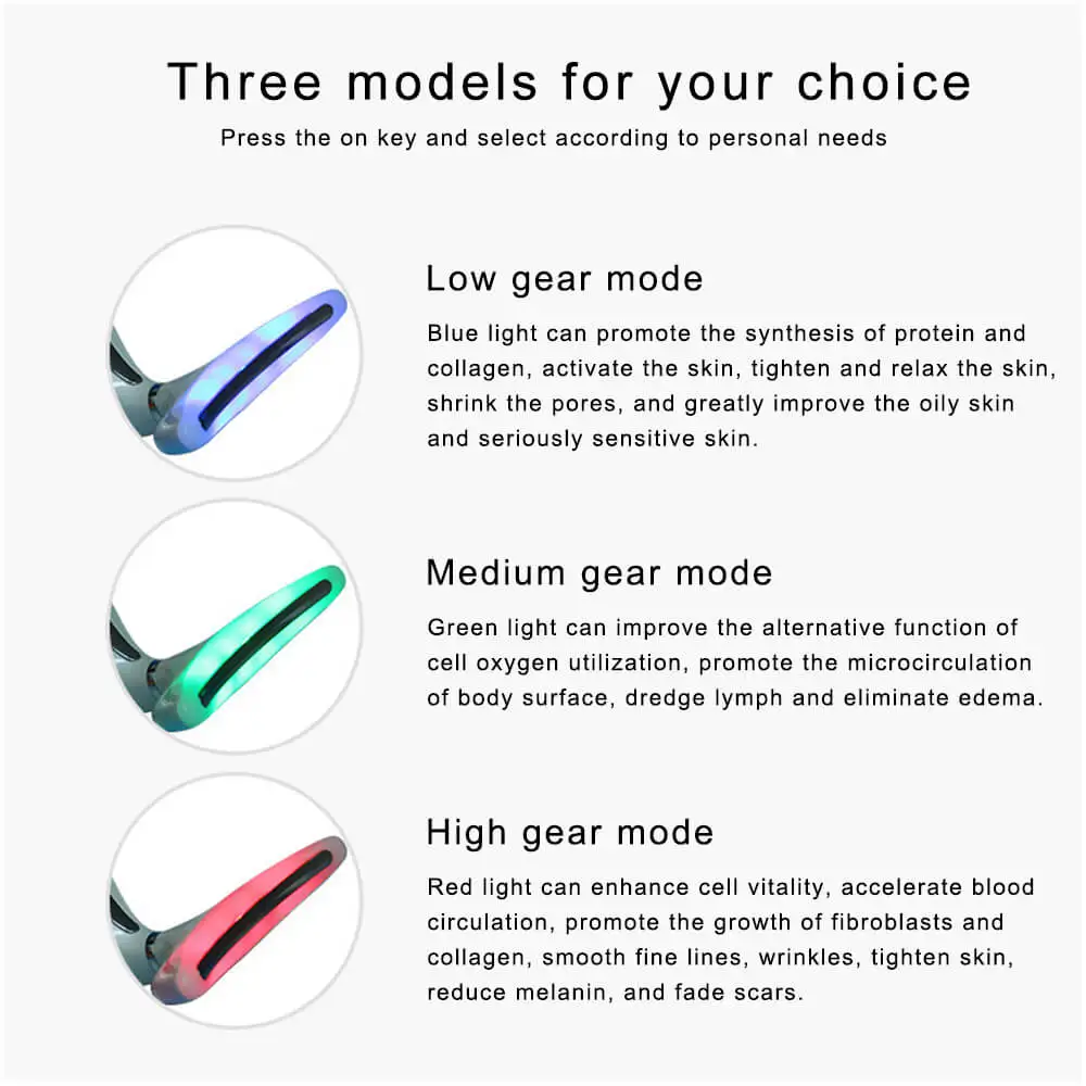 Green Light ( Middle-Speed Mode) Heating. midle vbration sense, the temperature is 50 degrees with 5 degree plus of minutes. Vibration frequency:950 times/minute. Green light can improve cells oxvgen,according to alternate function,promote body stomach circulation,dredge lymphoid and edema,and also has the effect of calming skin with equilibrium and stabilty. Blue Light (Low-Speed Mode) Normal temperature,low Vibration sense. Vibration frequency:6200 times/minute. Blue light is coldest light,it can promete the combination of albumen and avitene,activate skin,tighten loose skin,shrink pore,extremely improve oily and sensitive skin. Red Light ( High-Speed Mode) Heating. high vibration sense Vibration frequency:12500 times/minute Red light make cell viability enhance,accelerate blood circulation,promote fiber cell nucleus collagen growth. It has obvious effect to smooth line wrinkles and wrinkles,firm skin,fade out melanin and scar and so on.