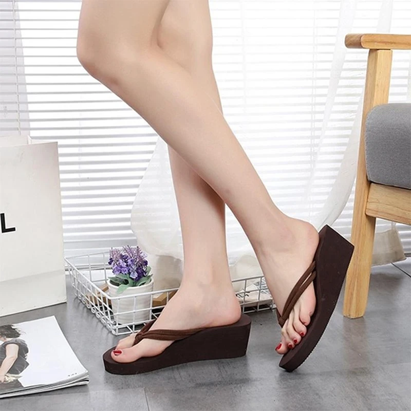 Женские шлепанцы; Однотонные Нескользящие вьетнамки на высоком каблуке; Пляжные сандалии на танкетке; Женская Обувь