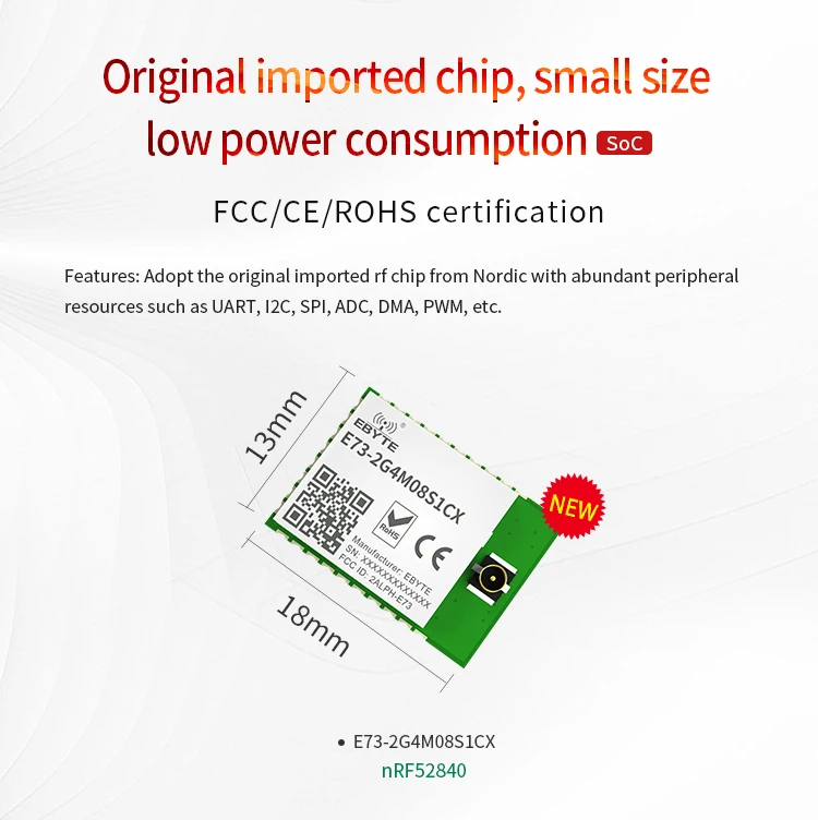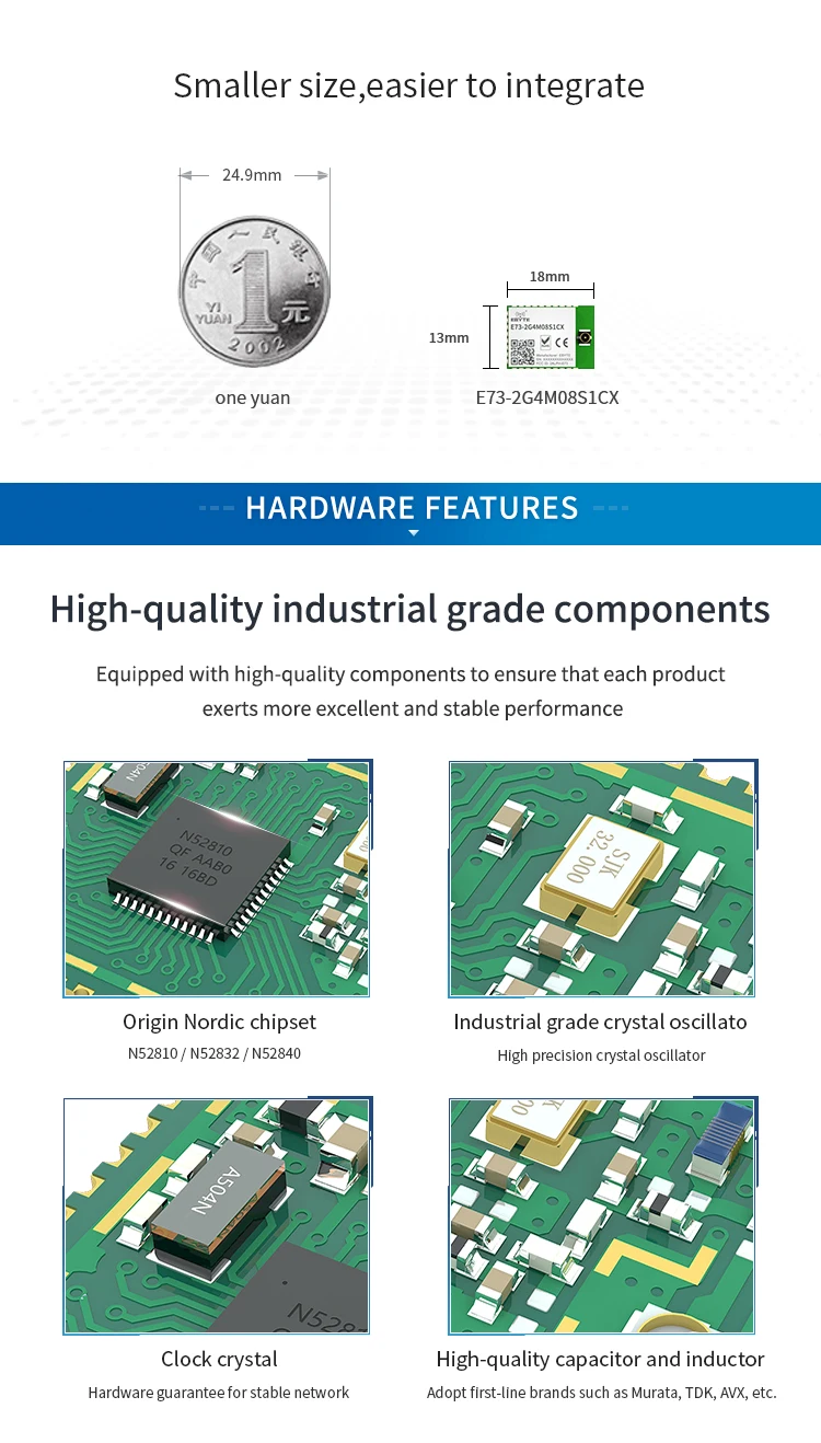 [Введение]:E73-2G4M08S1CX-это беспроводные Bluetooth модули, разработанные Chengdu Ebyte, которые имеют небольшой размер, низкое энергопотребление. Он принимает первоначально импортированный RFIC nRF52840 скандинавских, поддержка BLE 4,2 и BLE 5,0